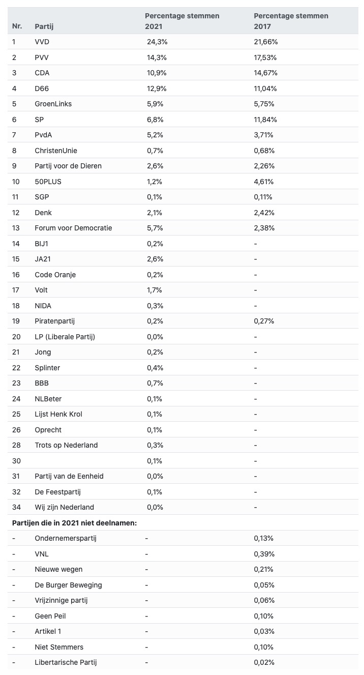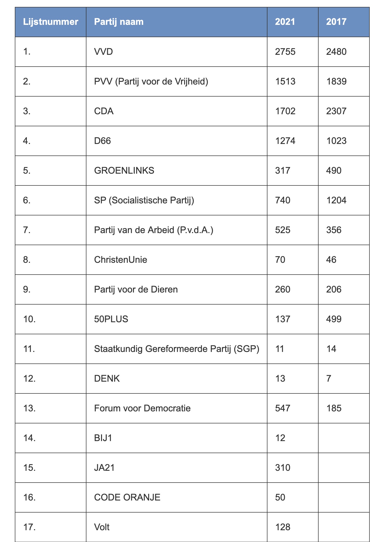In de tweede kolom staat het percentage dat deze partij behaalde bij de Tweede Kamerverkiezingen van 2017, als de partij daaraan deelnam.