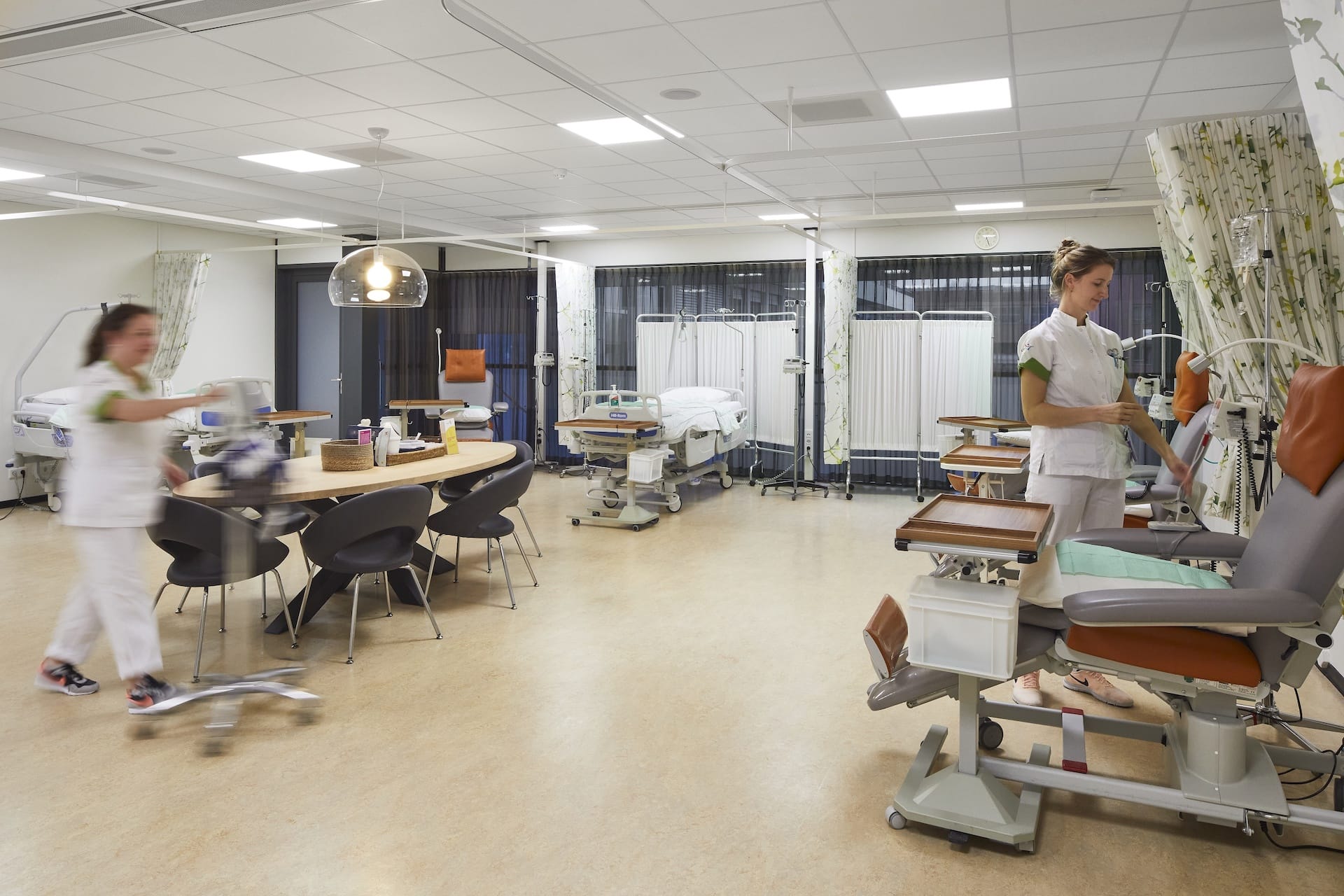 In de nieuwe dagbehandeling zijn het verblijf voor patiënten en de kantoorplekken voor de oncologisch verpleegkundigen fysiek van elkaar gescheiden. Oncologisch verpleegkundige Sanne Minkenberg: “Dat bevordert de rust en de privacy voor patiënten, bezoekers en medewerkers, zeker als er telefonisch vertrouwelijke gesprekken worden gevoerd. Beide ruimten zijn verbonden met een glazen wand, zodat medewerkers hun patiënten niet uit het oog hoeven te verliezen. Verder is er naast de dagbehandeling nog een aparte ruimte waar we in alle rust de eerste intake kunnen doen.”
