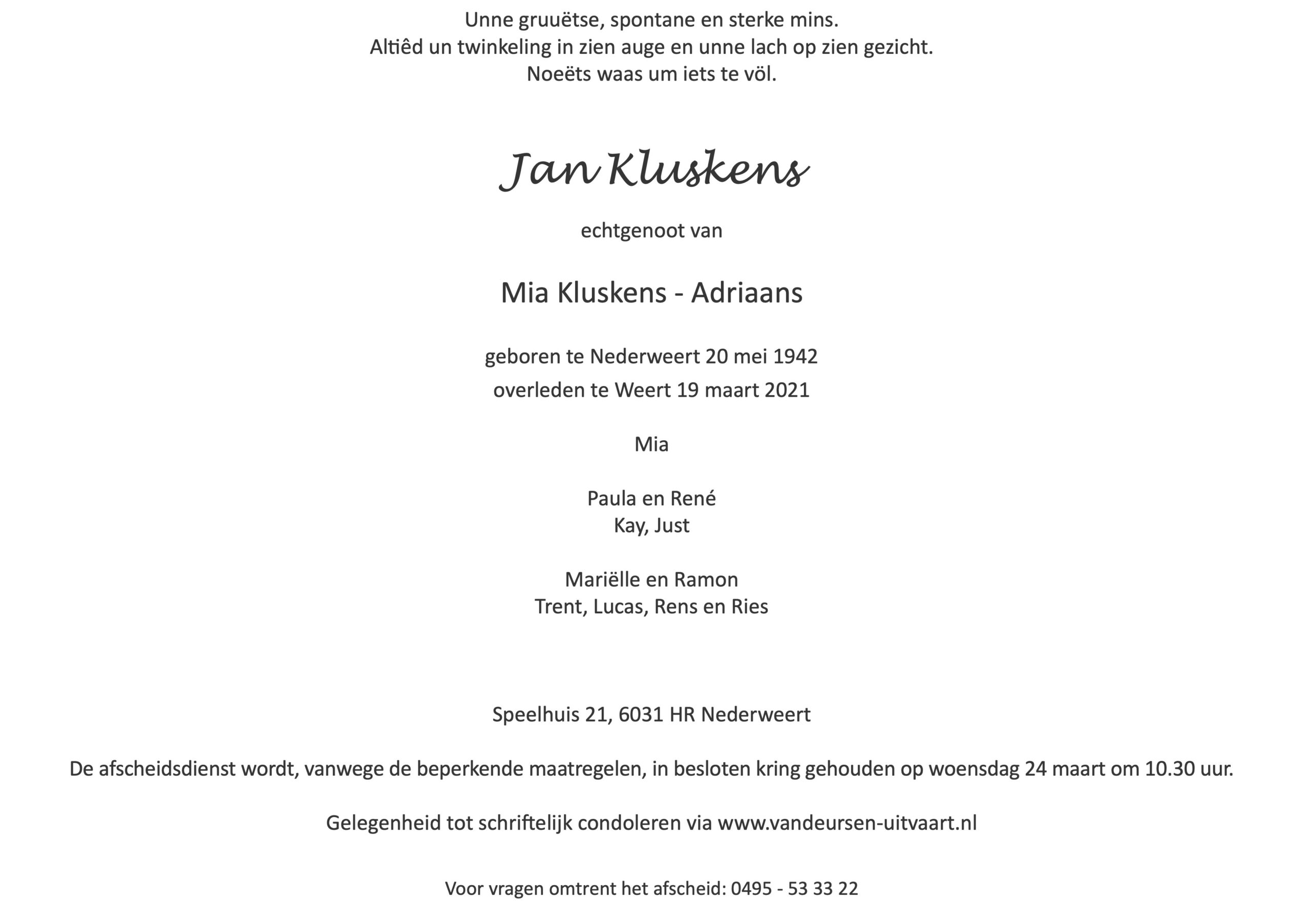 Sterkte aan de nabestaanden Rust zacht heer Jan Kluskens