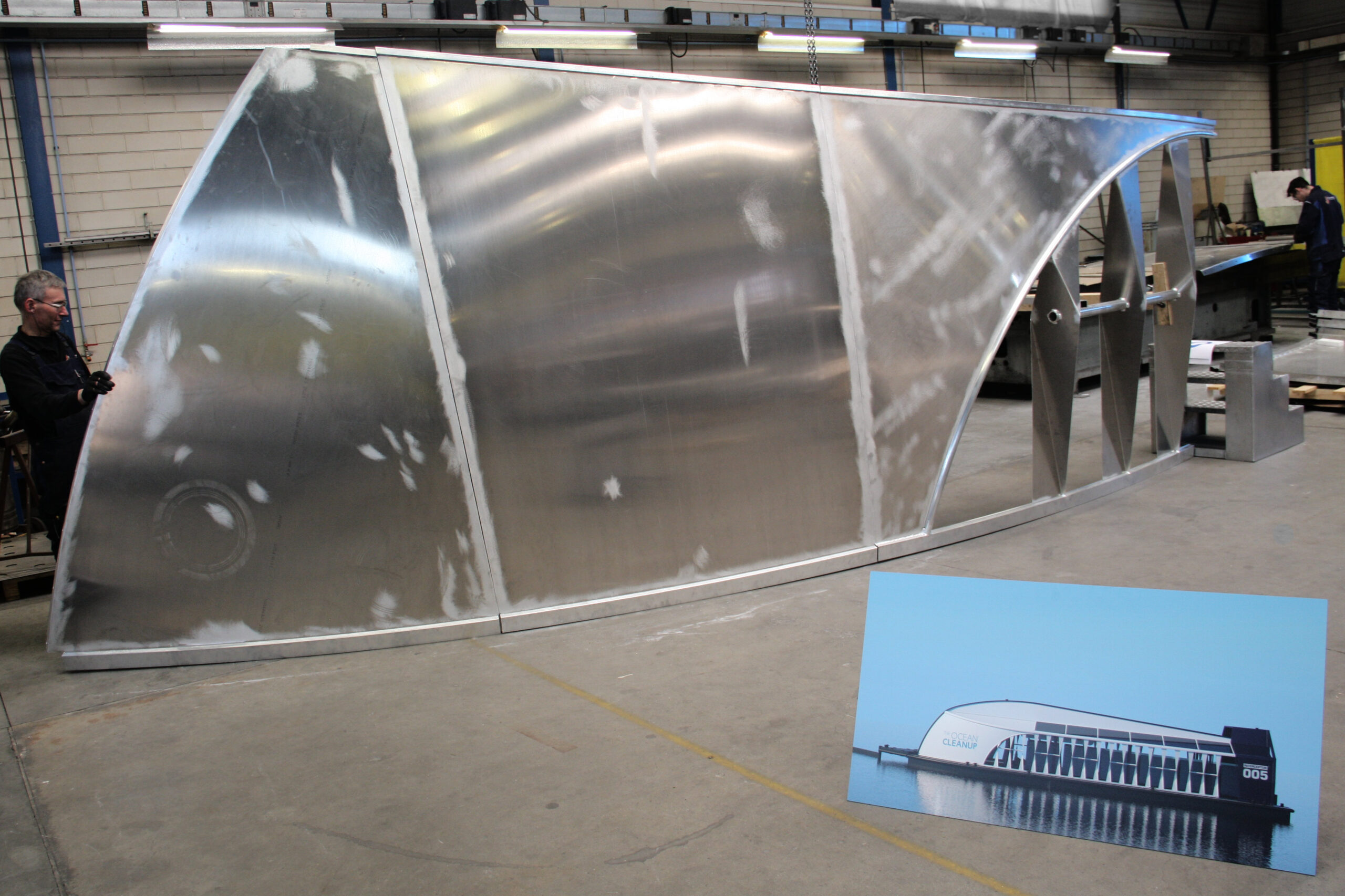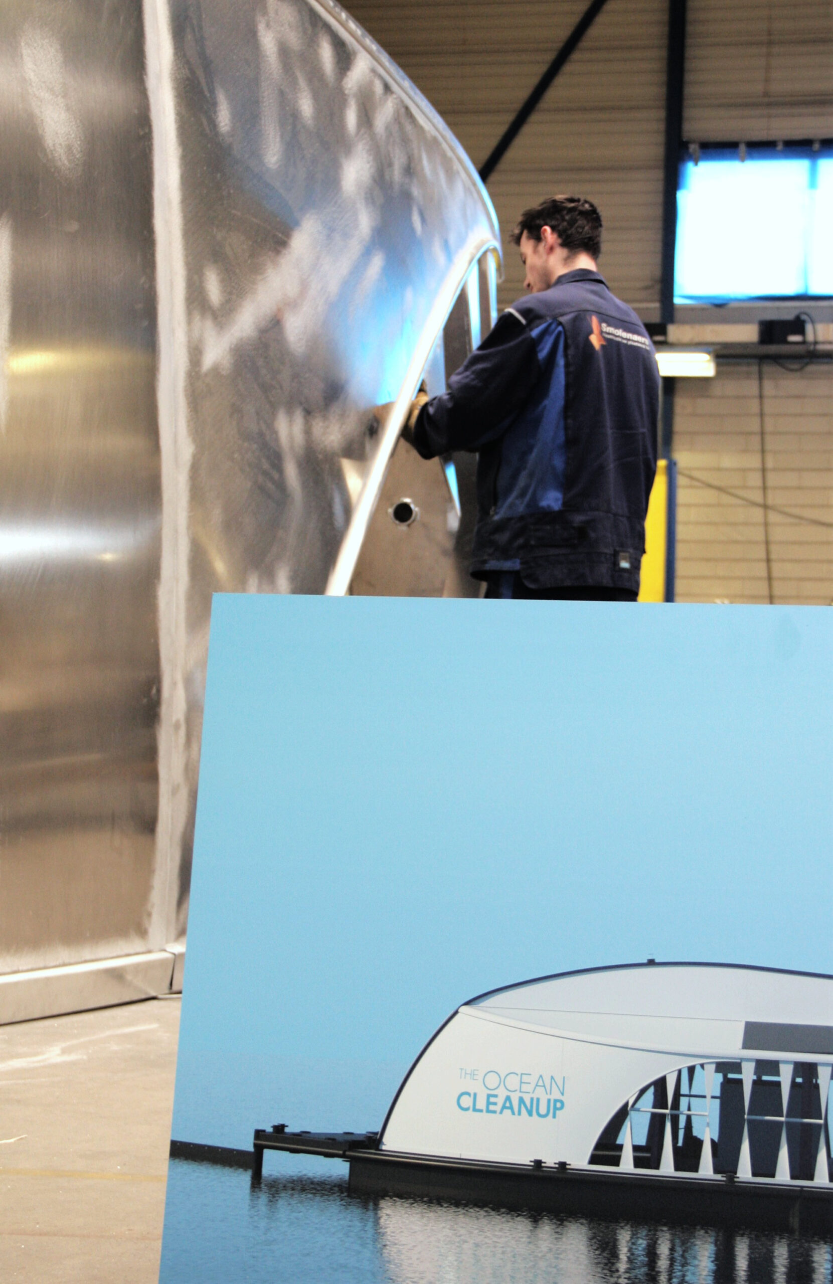 En laat die Interceptor nu op dit moment in de werkplaats van het Nederweertse Smolenaers worden geproduceerd. “Wij vinden het een geweldige eer om bij te dragen aan een ambitieus en idealistisch project als The OceanCleanUp.” Harm Vlassak, (bedrijfsbureau van Smolenaers) staat glimmend van trots bij de bouwtekeningen. Als fervent duiker en reiziger staat hij pal achter de doelen van dit Nederlands initiatief. “Ze vonden ons omdat wij als een van de weinigen kunnen walsen tot 4 meter. En we hebben hier dan ook een mooi staaltje walswerk mogen leveren, naast alle andere werkzaamheden als kanten/zetten, lasersnijden en lassen. Dat geeft wel een kick ja! En natuurlijk vinden wij het gaaf om te weten dat een band als Coldplay meewerkt aan het project dat nu in onze werkplaats staat.