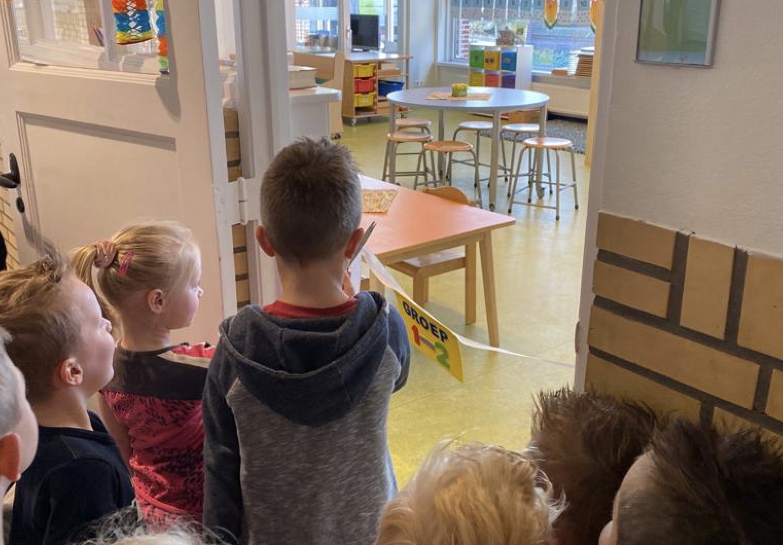 Door officieel het lint door te knippen hebben Fem en Kasper het nieuwe kleuterlokaal van IKC Budschop officieel geopend.