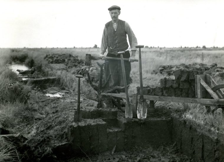 Bijschriften: Een turfsteker in de Ospelse Peel toont zijn gereedschappen. Foto: Jef Kirkels, collectie SGN