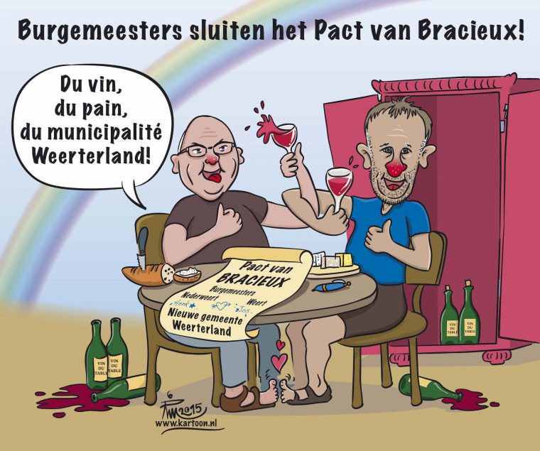 In 2015 sloten de toenmalige burgemeesters van Weert en Nederweert ‘vrede’ in het Pact van Bracieux. Illustratie: Rim Beckers.