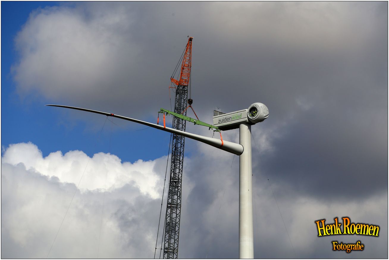 Dinsdag werden de drie rotorbladen omhoog gehesen. Dat zorgde voor een spectaculair schouwspel. Deze gigantische bladen zijn afgelopen weken door een gespecialiseerd transportbedrijf naar Ospeldijk gebracht.