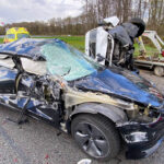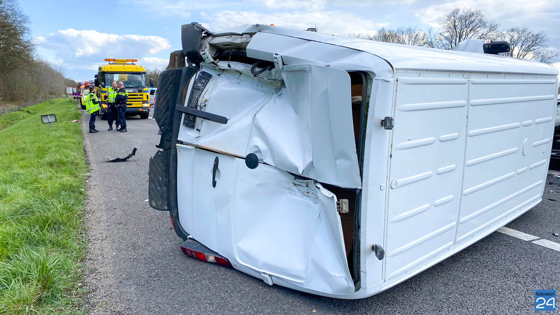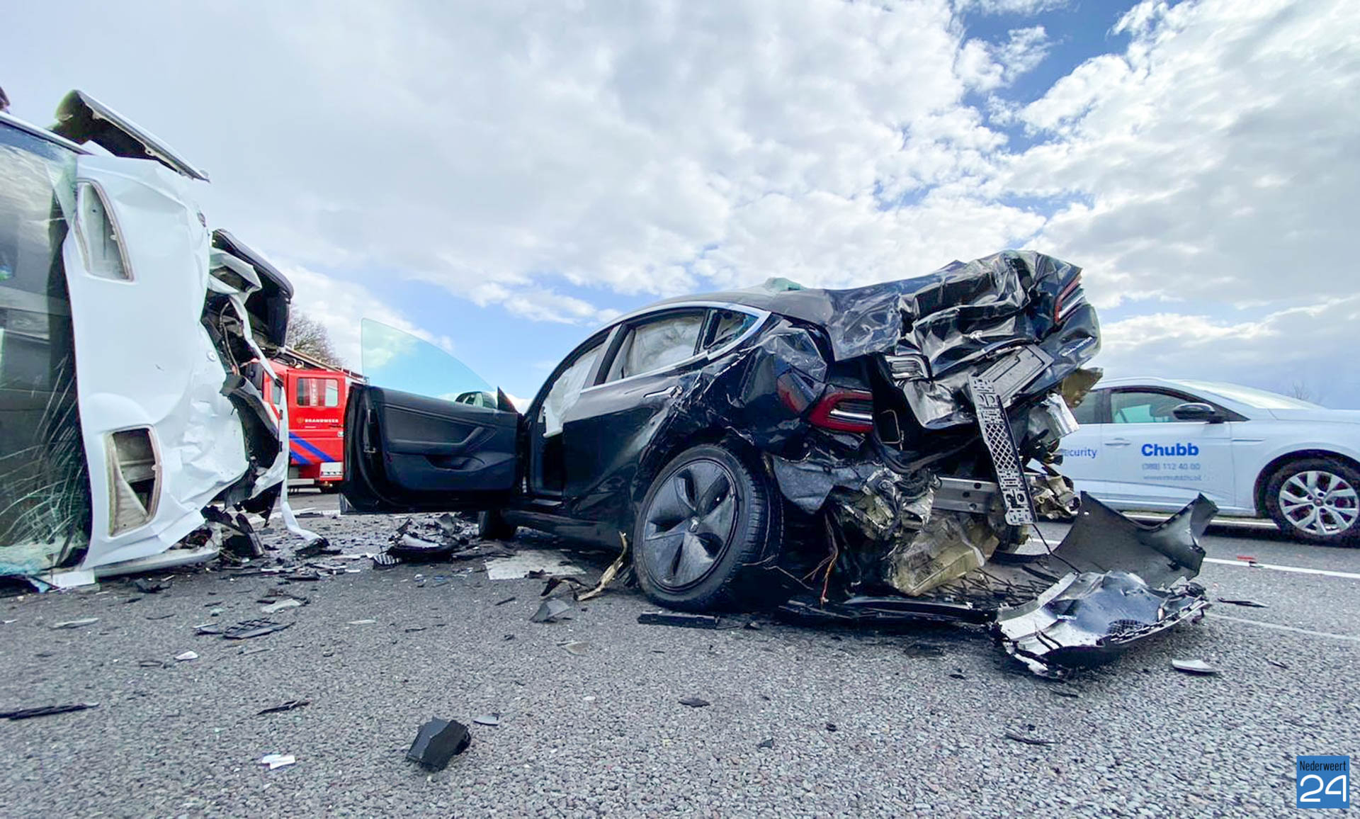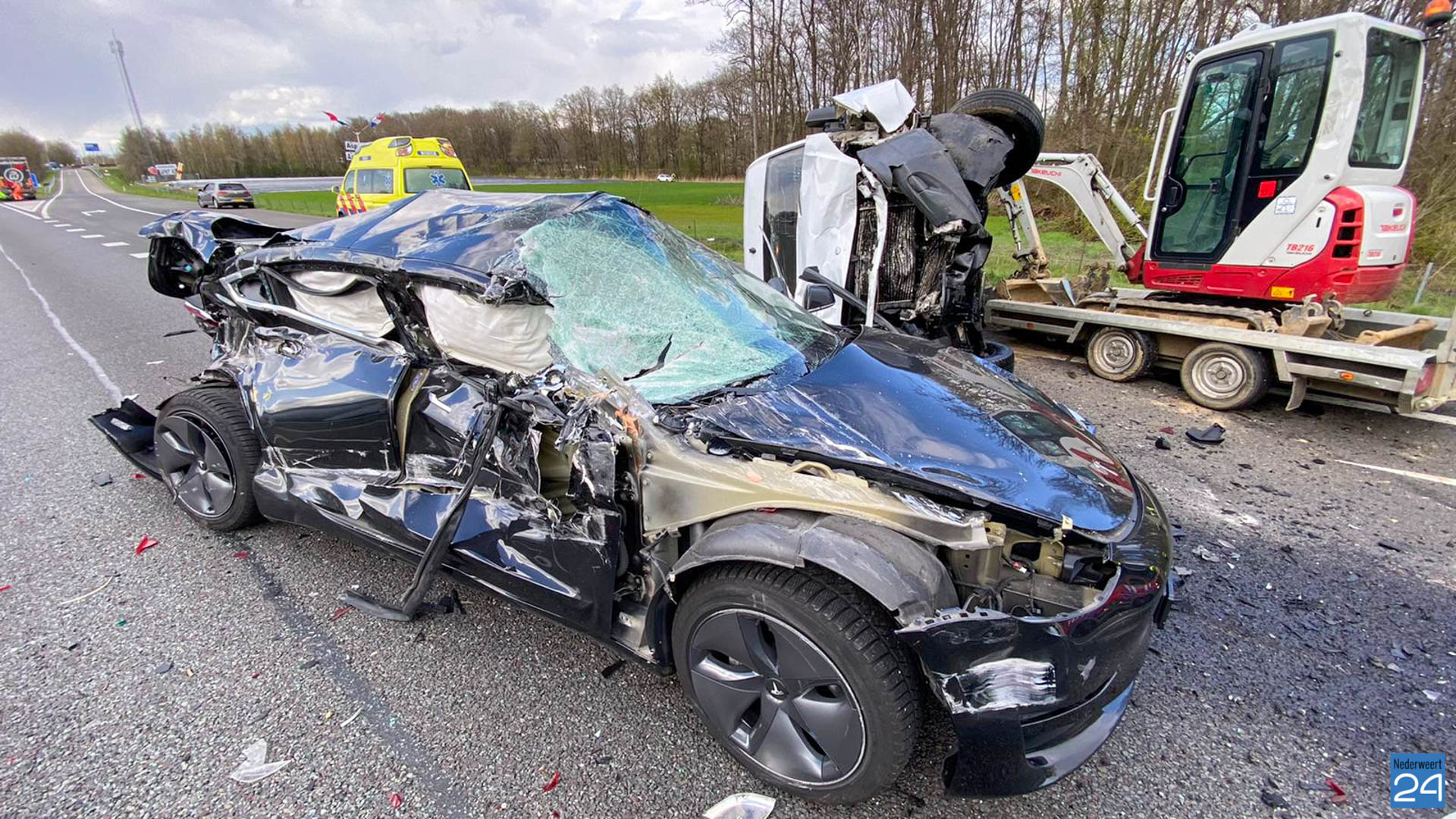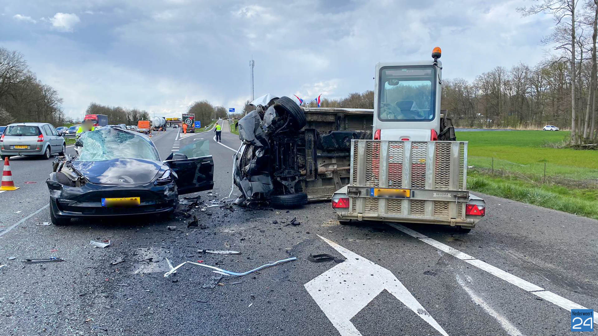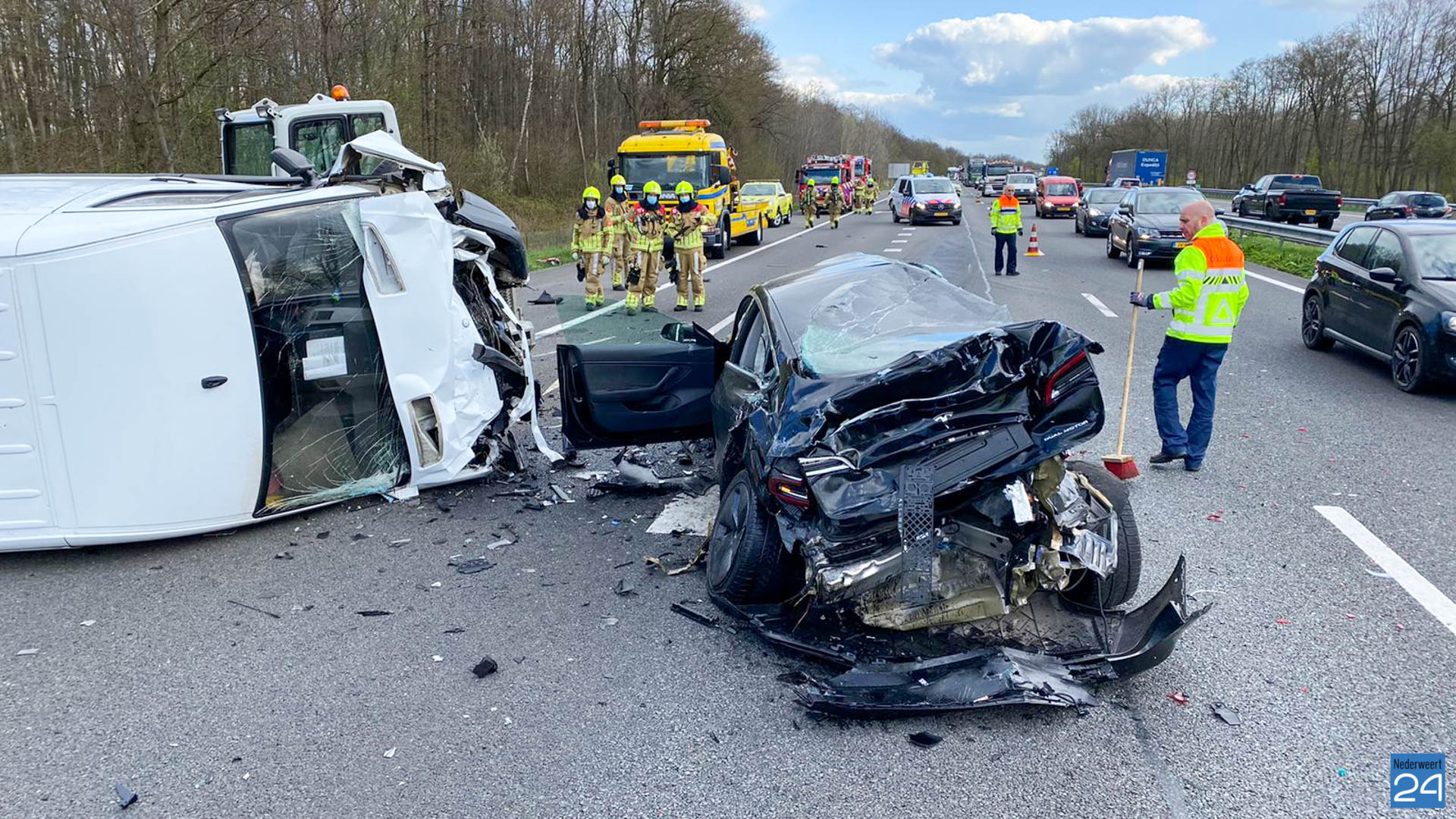 Het ongeval vond plaats in Noordelijke richting. Het bedrijfsbusje kantelde door de klap. De chauffeur van dit voertuig kwam met de schrik vrij. De bestuurder van de Tesla raakte gewond en is per ambulance overgebracht naar het ziekenhuis.