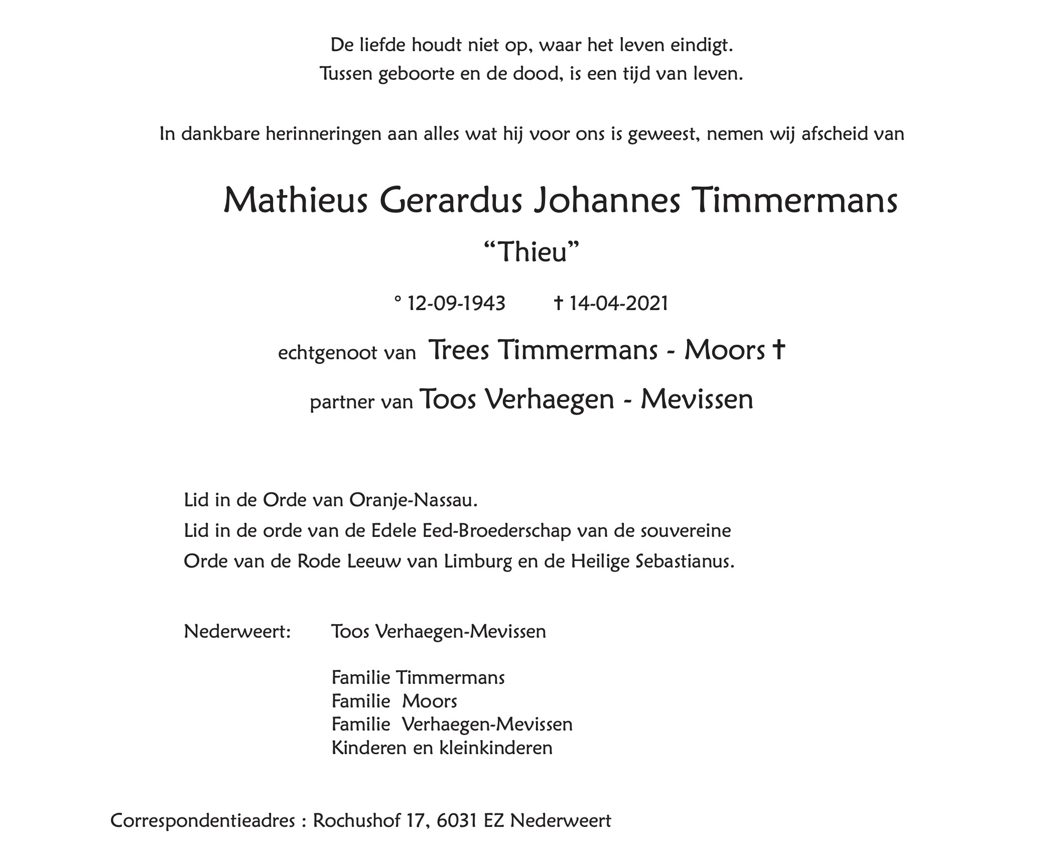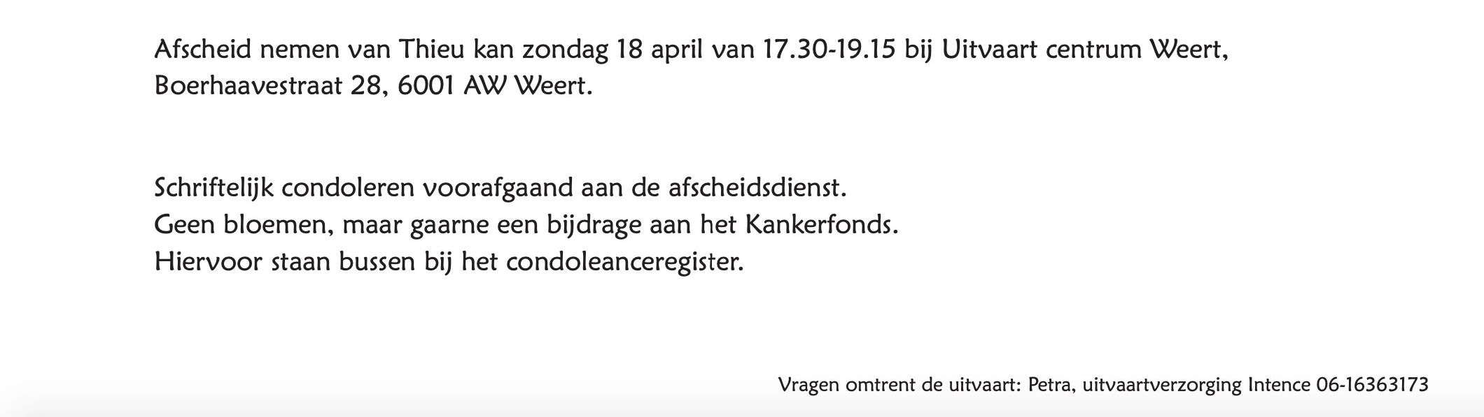 Gecondoleerd met dit grote verlies van Thieu en veel sterkte gewenst voor nu en in de toekomst. Hou de mooie momenten die jullie gezamenlijk hebben beleeft altijd in jullie gedachten aan hem en put hier ook kracht uit!!