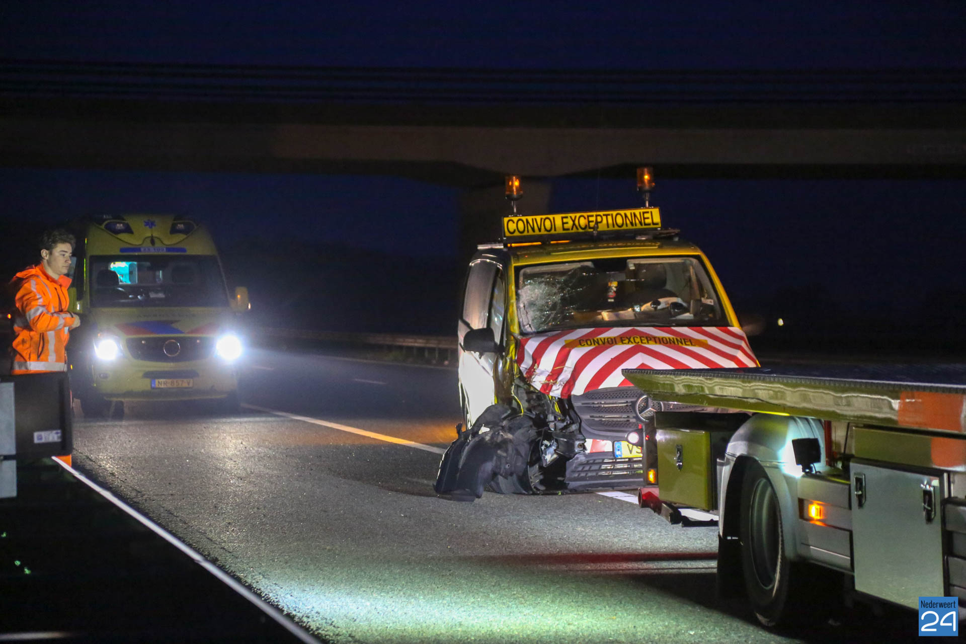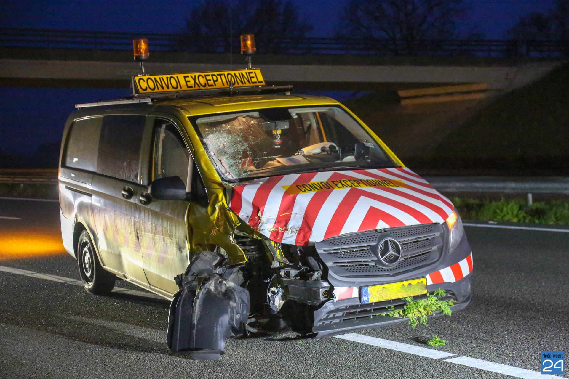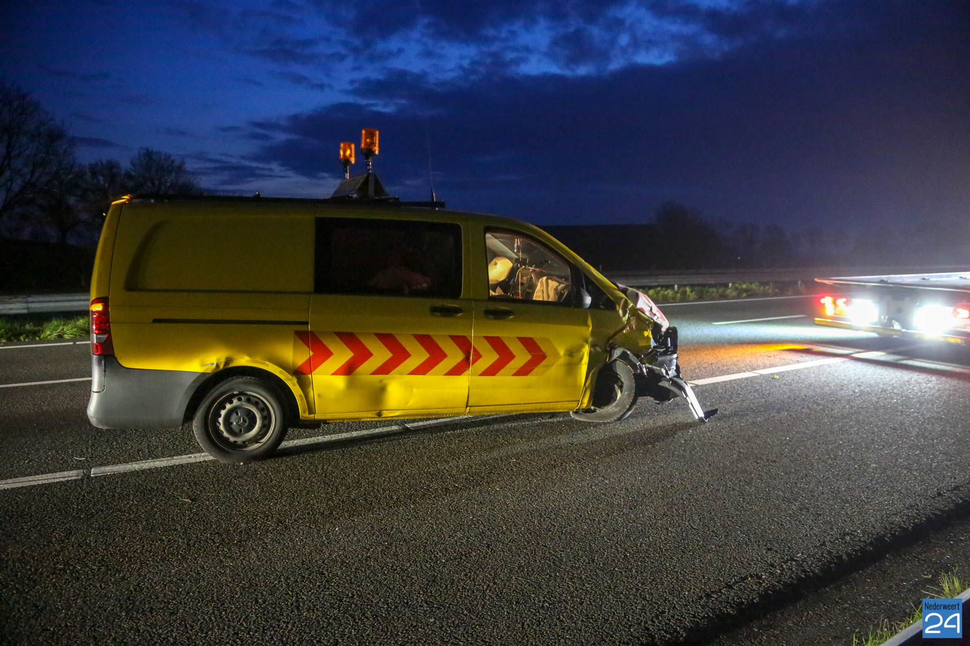Een bedrijfsbus is maandagochtend hard achterop een vrachtwagen gebotst. Dat gebeurde op de A2 bij Weert ter hoogte van het viaduct Tolheuvel. Het ongeval gebeurde tegen half zes.