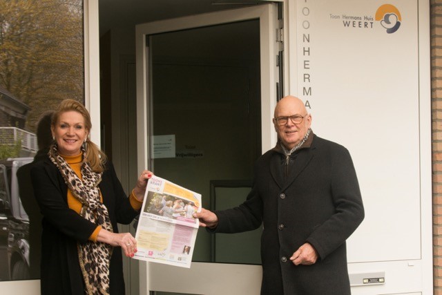 Het Toon Hermans Huis Weert bestaat deze maand tien jaar. Vanwege dit tweede lustrum heeft het huis een speciale Toons Krant uitgegeven, die huis aan huis in de regio Weert wordt verspreid. Donderdag 17 april overhandigde Cindy Denessen van Weert Media Groep het eerste exemplaar van de Toons Krant aan voorzitter Henk Evers van het Toon Hermans Huis Weert.