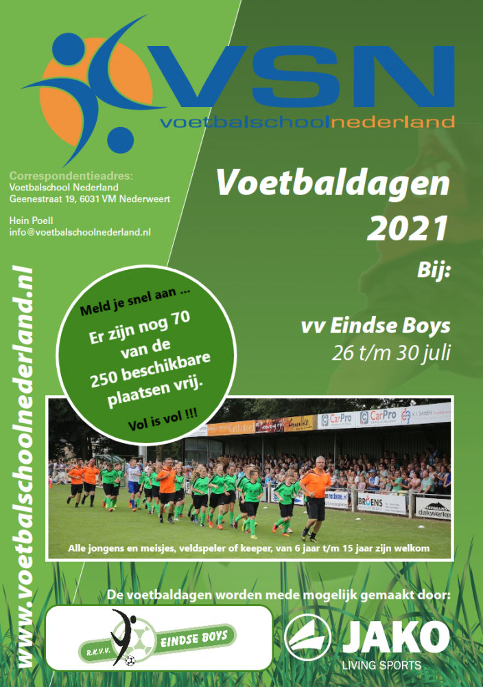 Op dit moment zijn er nog 70 van de 250 plaatsen beschikbaar, mede door inschrijvingen van 2020 welke zijn doorgezet naar 2021. Tot 1 juni kun je je inschrijven, maar wacht niet te lang, want vol is vol. Informatie vindt je op de site van VSN, waar je ook terecht kunt voor de aanmelding: www.voetbalschoolnederland.nl