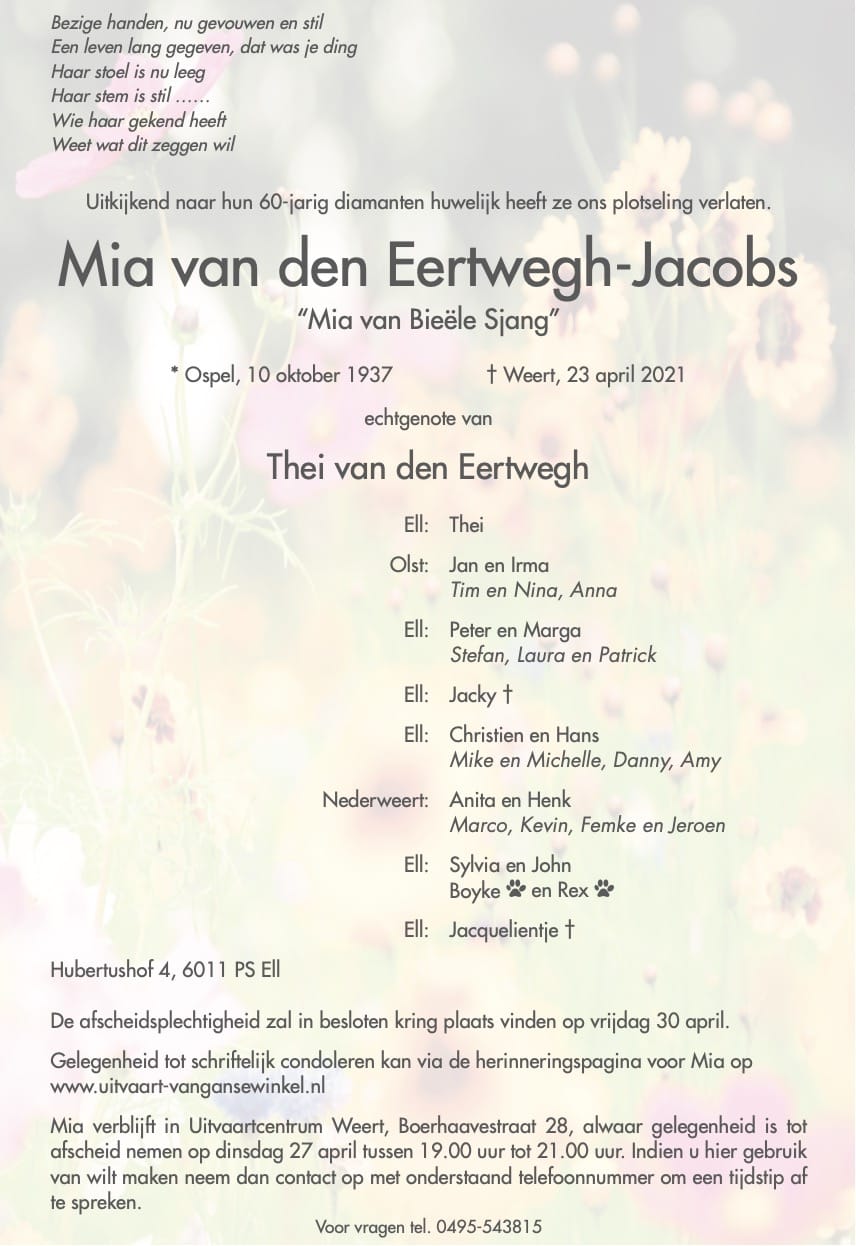 Overlijdensbericht Mia van den Eertwegh-Jacobs †