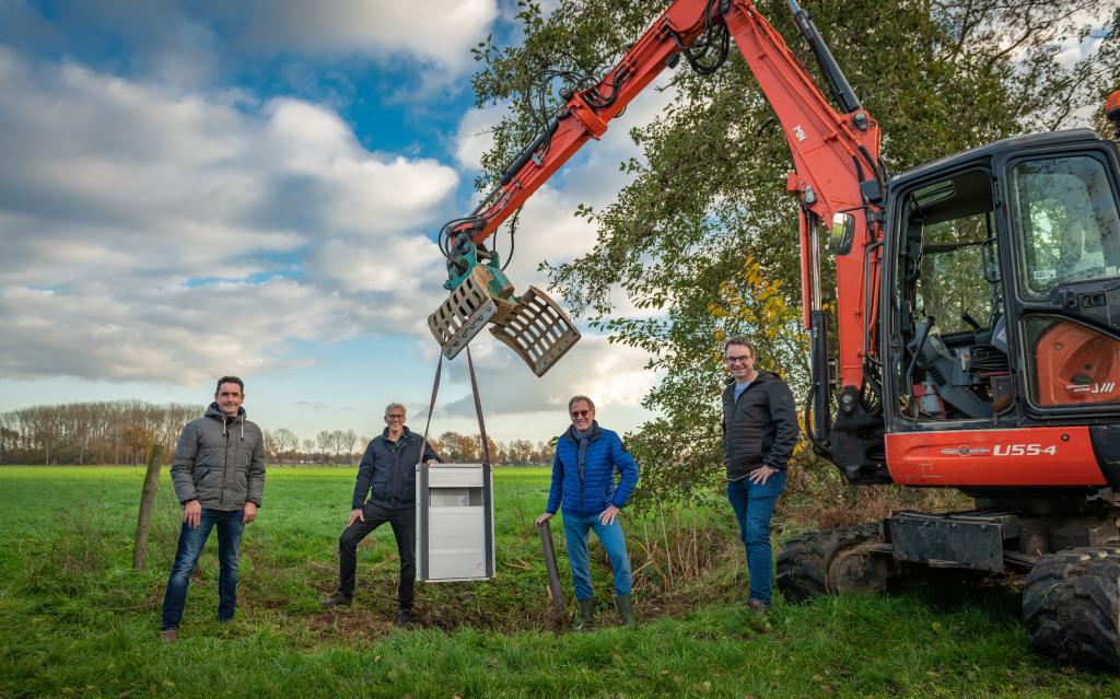 V.l.n.r.: Edwin Kurstjens, Har Frenken (Waterschap), Henk Hermans en Peter van Dijck (LLTB). In een sloot bij een weiland van melkveehouder Edwin Kurstjens uit Montfort werd een van de eerste stuwen in het kader van deze actie geplaatst.