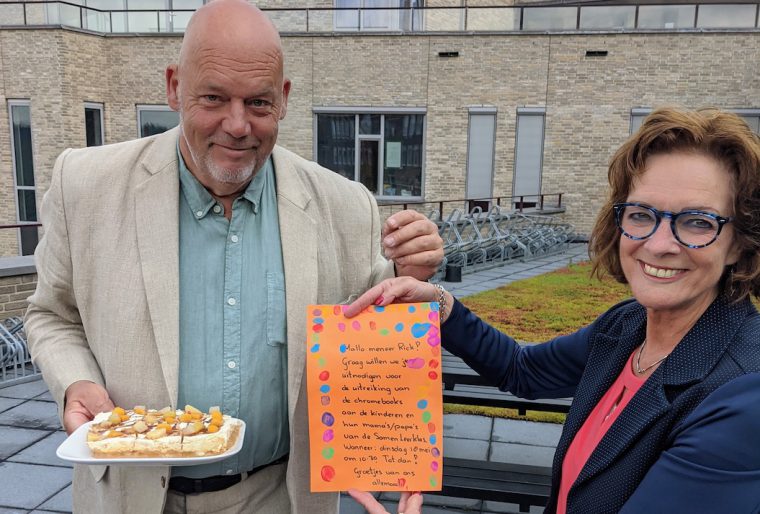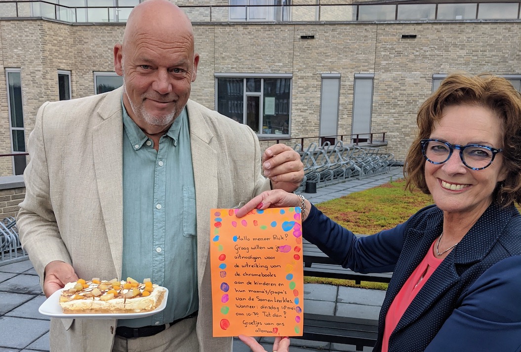 Op dinsdagochtend 18 mei werd er een klein feestje gevierd op het dakterras van de brede school Markeent in Weert. Ouders en kinderen van de ‘Samenleerklas’ mochten de chromebooks in ontvangst nemen die gesponsord zijn door Rick Laurens Janse.
