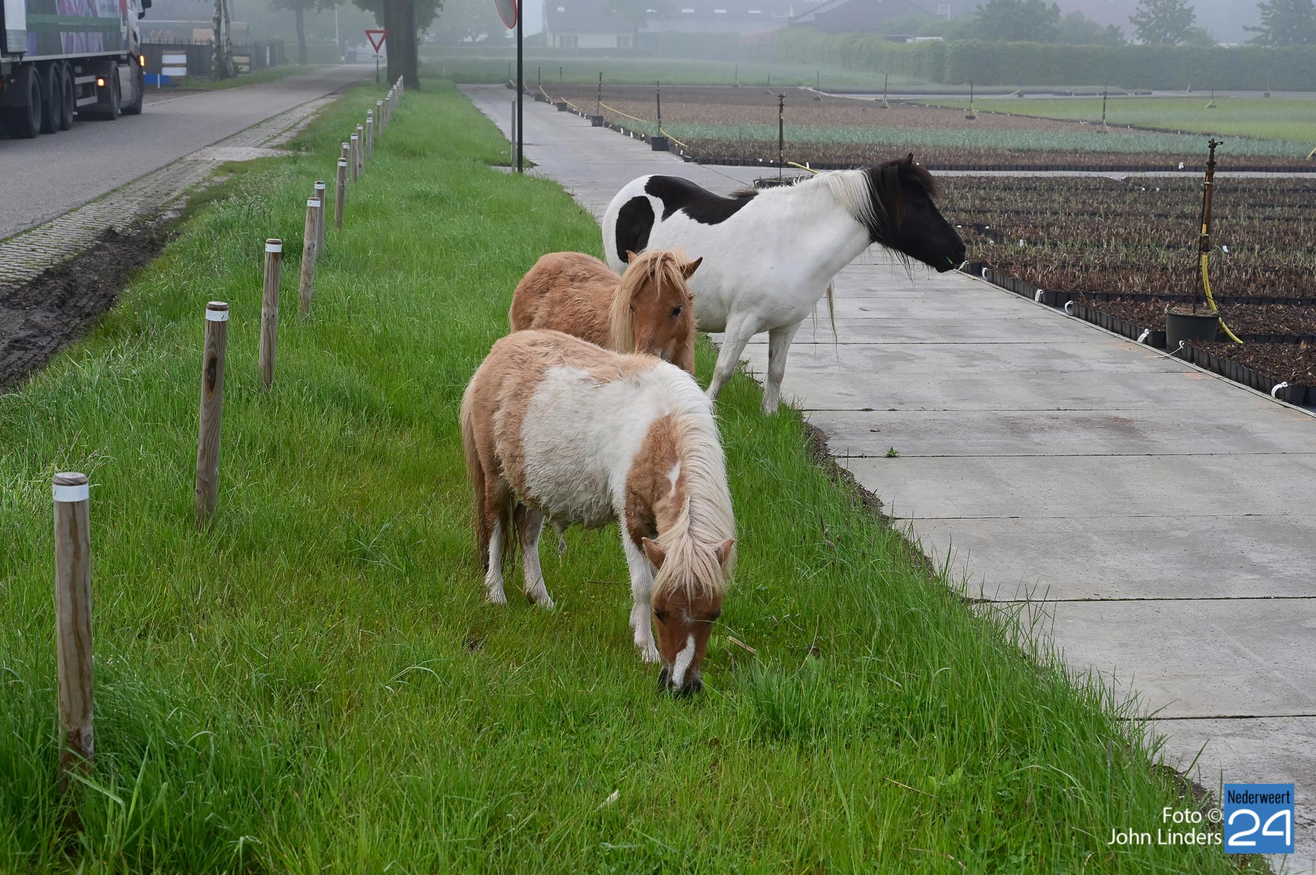 Vroege wandelaars uit Ospeldijk die de hond aan het uitlaten waren zagen aan de Ontginningsdijk vrijdag 3 pony’s langs de weg staan.