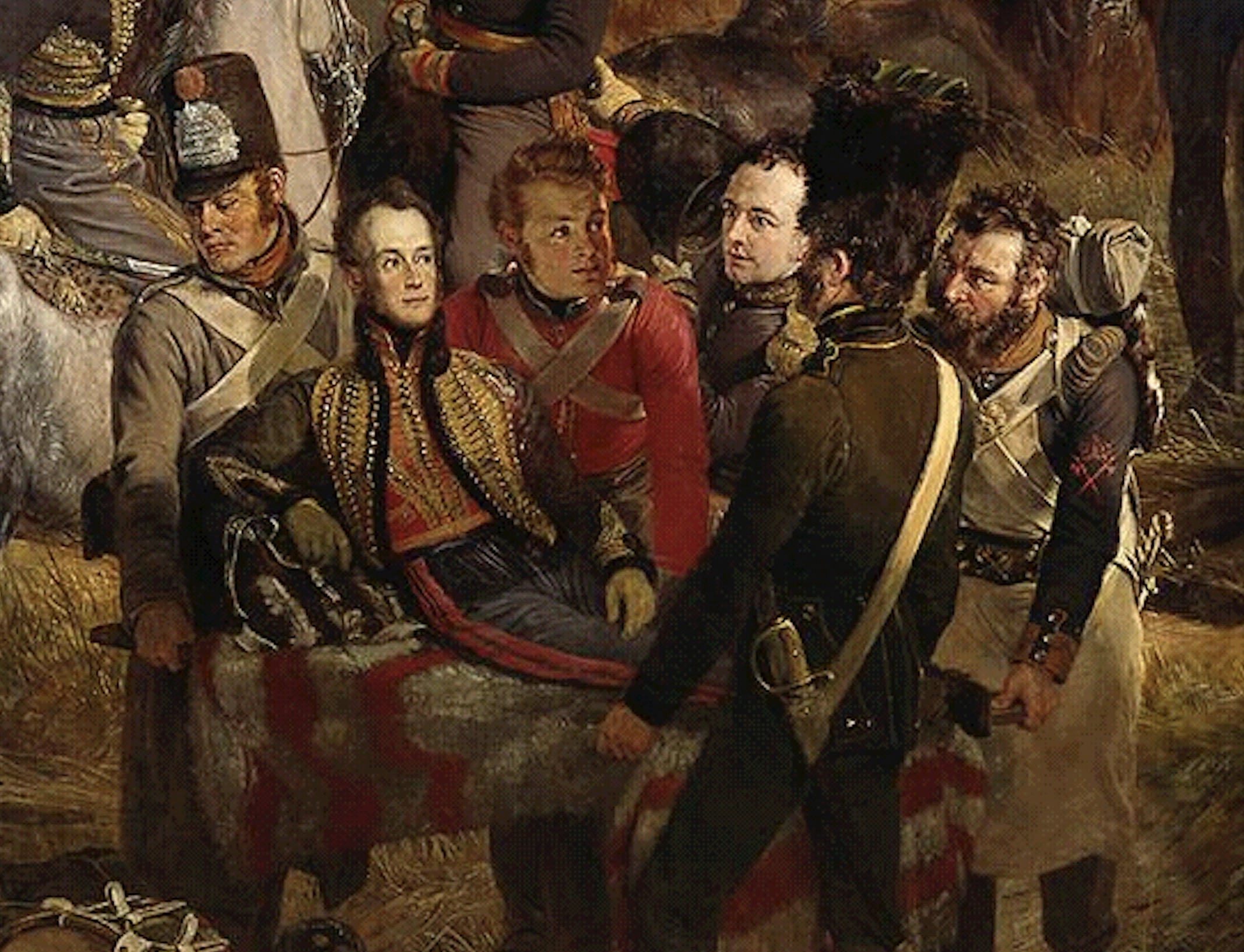 Detail uit ‘De Slag bij Waterloo in 1815’. De gewonde prins Willem ligt op een deur. Geheel rechts (met baard) Hendrik Raemaekers. Foto: Rijksmuseum.