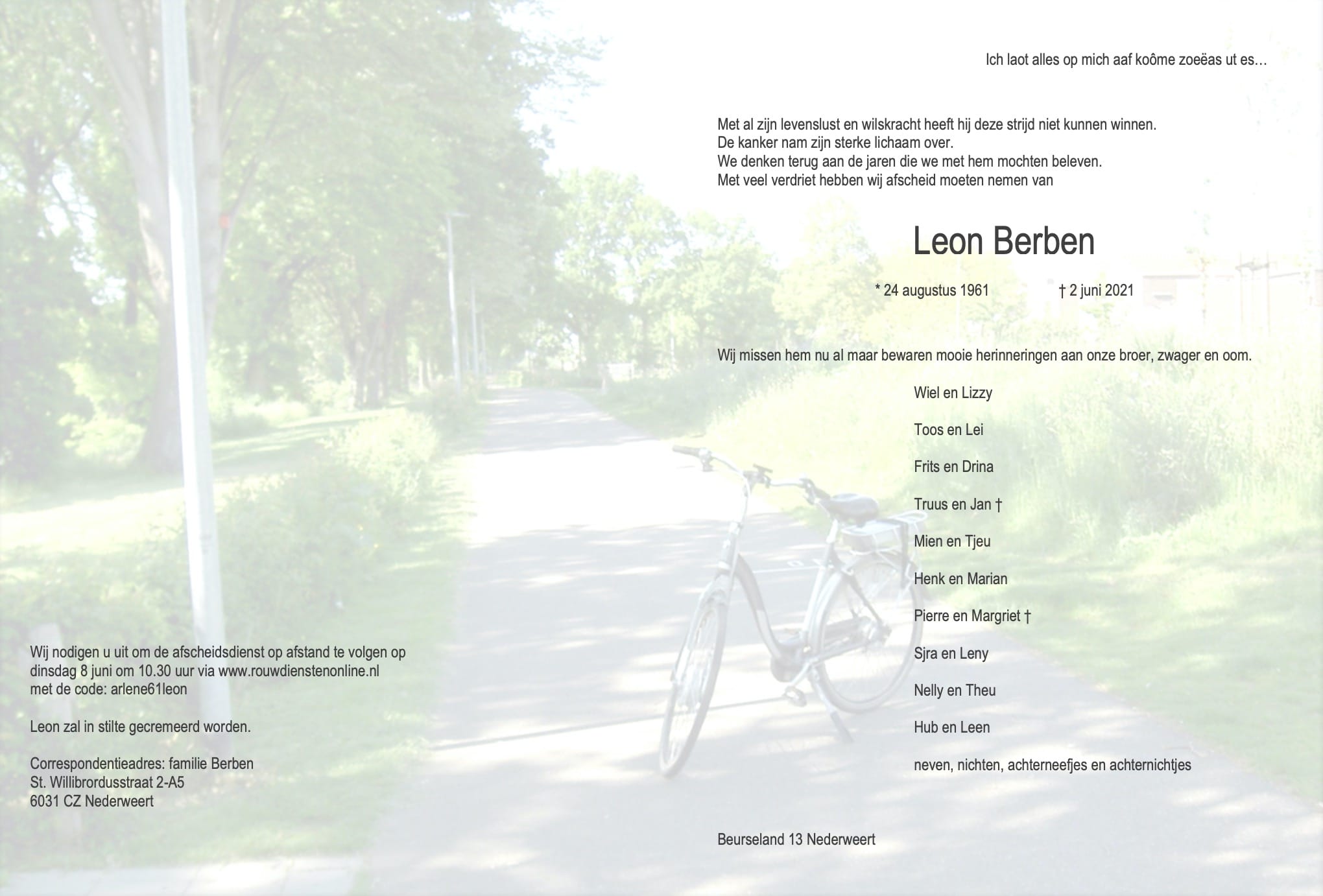 Familie Berben.Gecondoleerd met t overlijden van jullie broer en oom leon.Heel veel sterkte voor nu en de komende tijd.Jac en Drien de Leeuw.