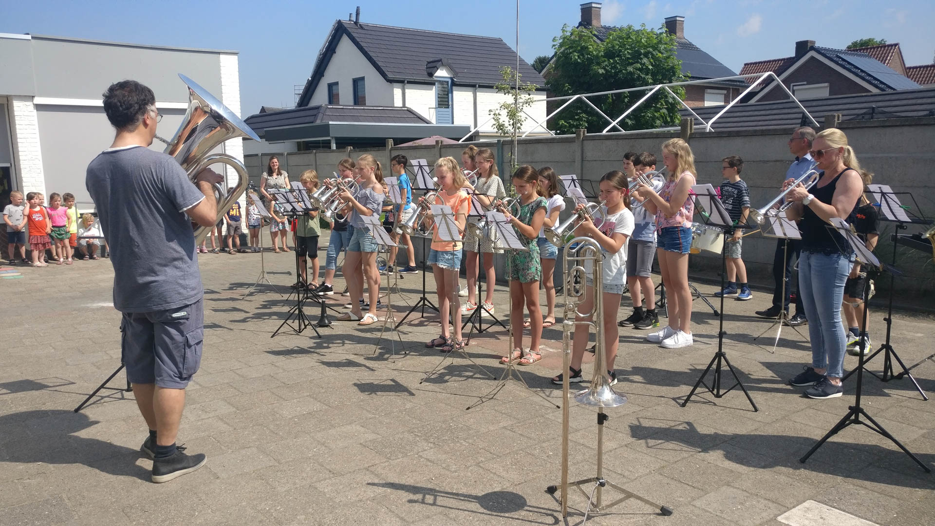 Voor vier verschillende ramen, ieder aan een andere kant van de school, volgden de groepen 1-2, 3-4, 5-6 en 7-8 optredens door leden van de fanfare. Het merendeel van deze leden is leerling op de basisschool en trad dus op voor eigen klasgenootjes. Tijdens de concerten maakten alle leerlingen kennis met de bugel en de trompet, de hoorn, trombone en bas, de saxofoon en het slagwerk. De leerkrachten in de klas vertelden de leerlingen over de achtergrondinformatie van de instrumenten. Waar zijn ze van gemaakt, klinken ze hoog of laag, hard of zacht, waar zitten ze in het orkest, enz. Ook deelden de kinderen met elkaar hoe ze de instrumenten vonden klinken en welk gevoel de muziek bij hen opriep. Daarnaast keken de klassen terug op de vele raamconcerten die gegeven zijn in de coronaperiode. Als feestelijke afsluiting speelden alle muzikanten op de speelplaats ‘Blauwe dag’ van Suzan & Freek.