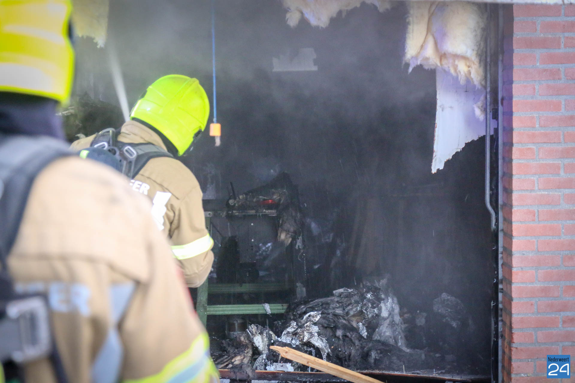 Achter de garagedeur zat een houten wand met isolatiemateriaal. Het was nog een flinke klus om deze wand te verwijderen. Mogelijk is kortsluiting de oorzaak van de brand.