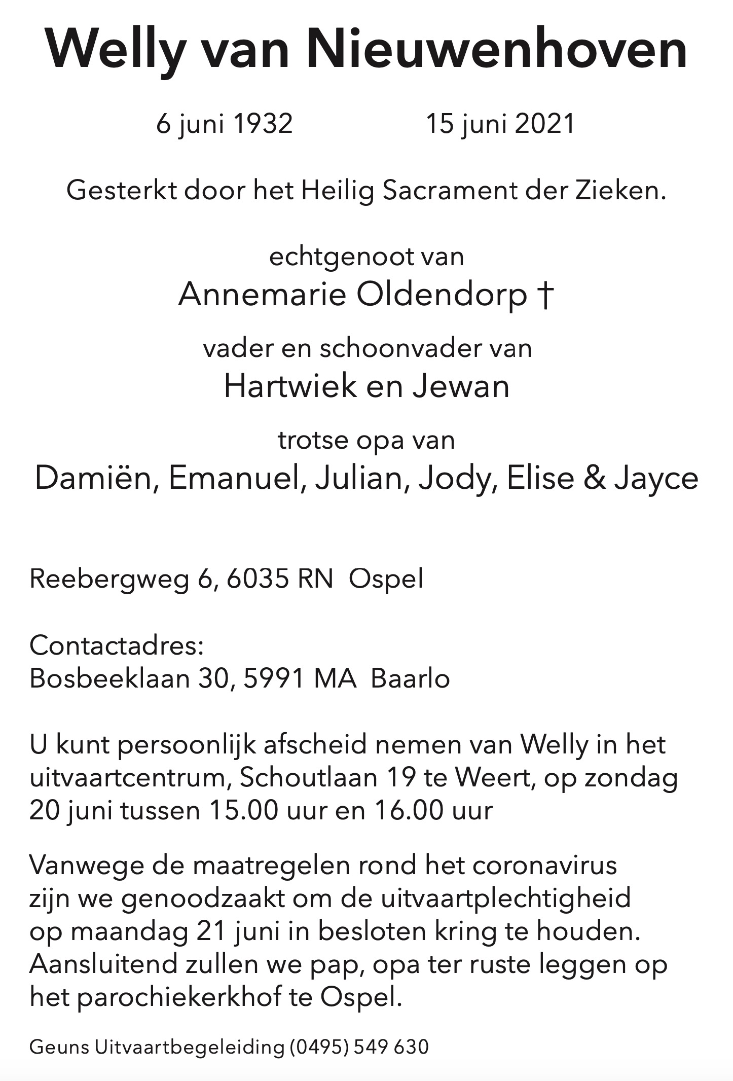 Overlijdensbericht: Welly van Nieuwenhoven †
