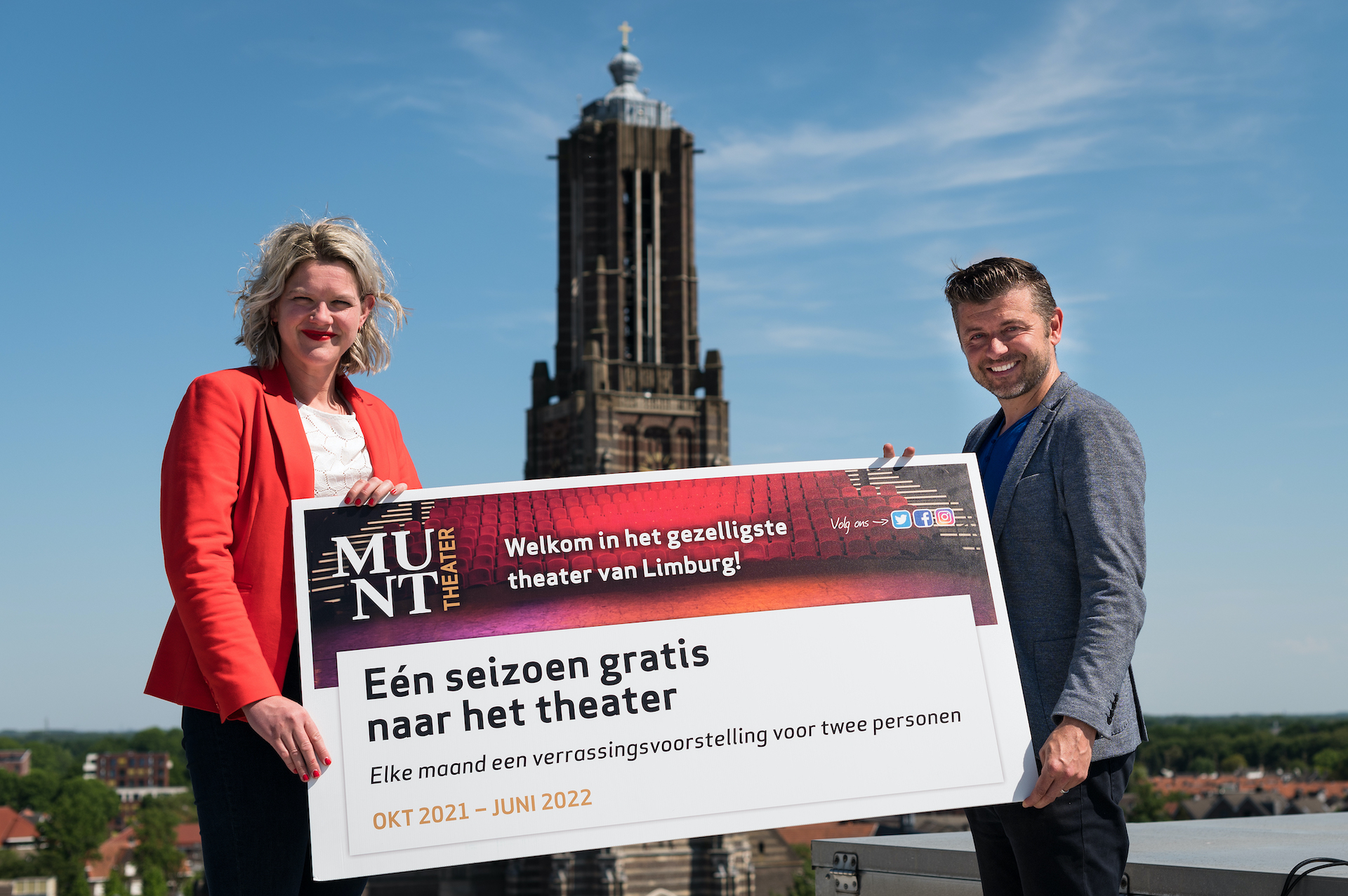 Met een prachtige video, deels opgenomen op het dak van het theater in Weert, werd de heropening gevierd. Ook wethouder cultuur Geert Gabriëls en directeur van het Munttheater Colinda Vergouwen klommen samen op het dak. “Normaal gesproken zou ik de wethouder tijdens de previewavond in mei de gloednieuwe programmabrochure overhandigen. Nu schreeuwen we graag samen van de daken dat er eindelijk weer ruimte is voor kunst en cultuur. We hebben onze gasten en artiesten enorm gemist. De gesprekken, ontmoetingen… De ziel was uit ons gebouw de afgelopen maanden. Om te vieren dat het gezelligste theater van Limburg weer open is, trakteren we op één seizoen gratis theater.“ aldus Vergouwen.