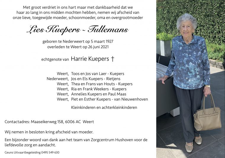 Overlijdensbericht Lies Kuepers ~ Tullemans †