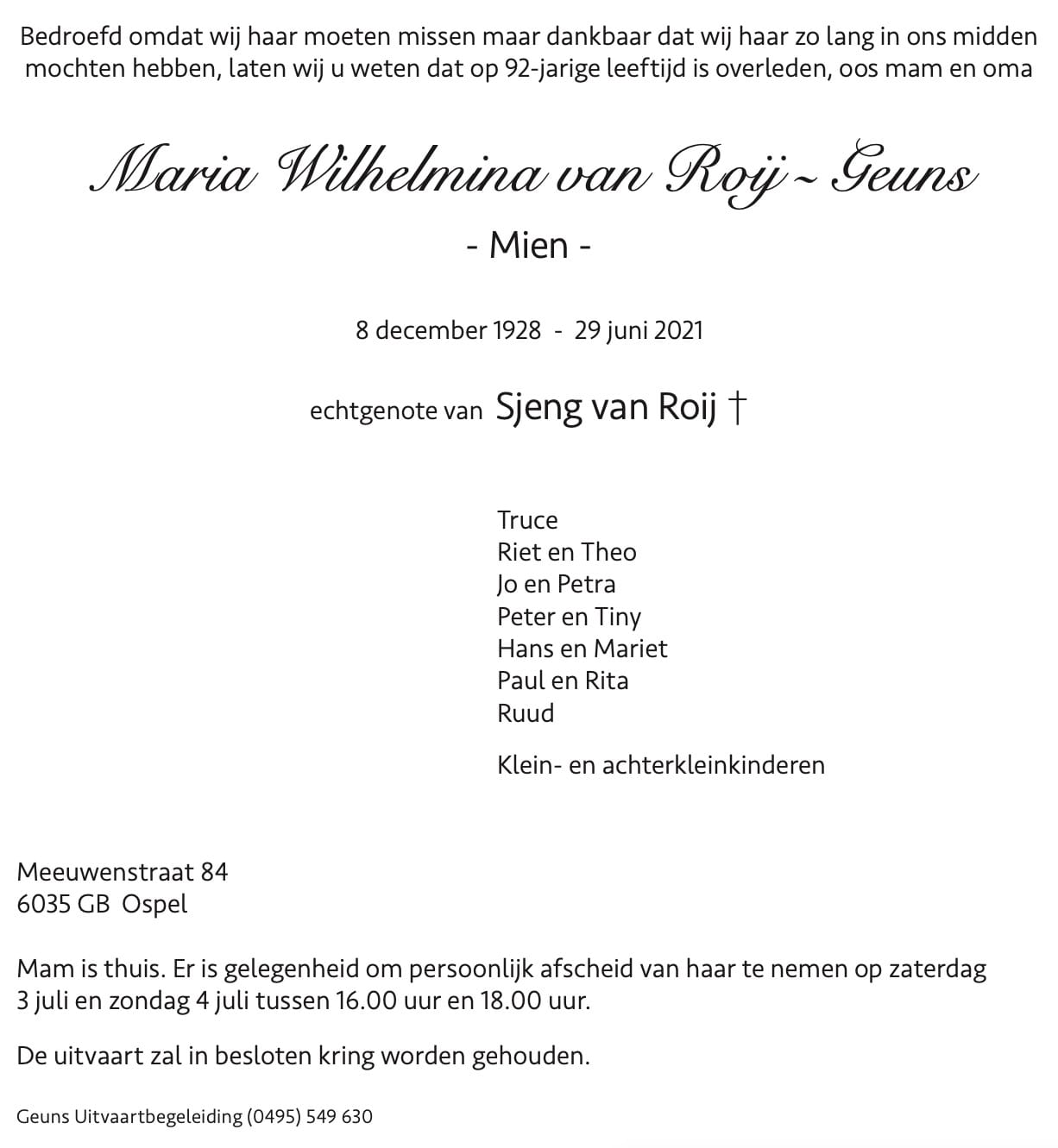 Overlijdensbericht: Maria Wilhelmina van Roij ~ Geuns †