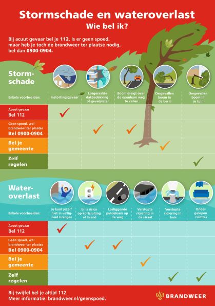 Op wachtnietopwater.nl vind je ook tips voor maatregelen die je kunt nemen als er sprake is van wateroverlast. Als het water je huis binnenstroomt, is het bijvoorbeeld belangrijk om gas en elektriciteit uit te schakelen. Zo voorkom je brand of kortsluiting. Een andere belangrijke maatregel is om alarmnummer 112 alléén te bellen bij acuut gevaar. Hiervan is sprake wanneer iemand direct in gevaar is of dreigt te raken. Door 112 alleen te bellen als dat écht nodig is, voorkomen we dat de meldkamer overbelast raakt. En dát zorgt er weer voor dat mensen die acuut hulp nodig hebben ook geholpen kunnen worden. In onderstaande afbeelding zie je precies welk nummer je op welk moment kan bellen. Tip: bewaar de afbeelding op je telefoon!