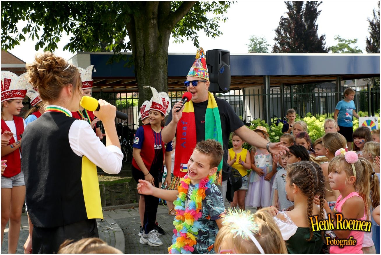 De kinderen hebben ’s morgens spellen gespeeld: de groepen 1-2 op het schoolplein en de groepen 3-8 op het terrein van RKSVO. Aan het einde van de ochtend barstte het carnavalsfeest pas echt los met optredens van Dri-j kiëer Niks en Maikel & Daphne (DZN). Na de middagpauze werd er eerst afscheid genomen van twee collega’s en daarna van groep 8. Dit ging weer gepaard met veel water en eindigde op een buikschuifbaan. Als afsluiting was er koffie en thee voor de ouders van groep 8. Daarna startte voor alle kinderen de vakantie.