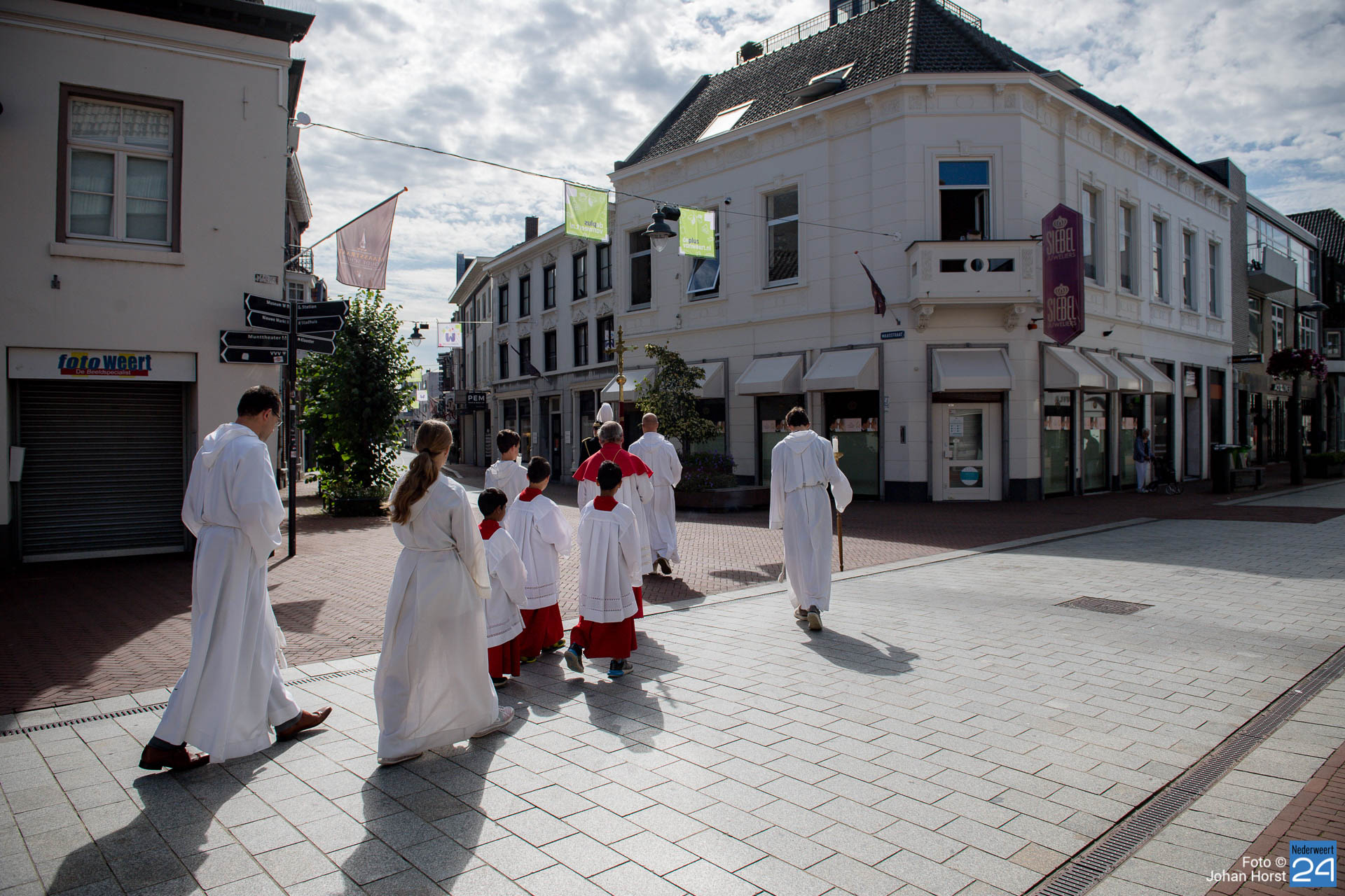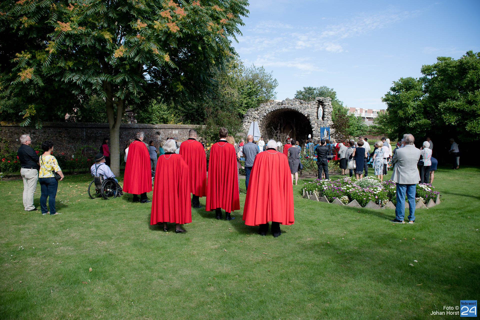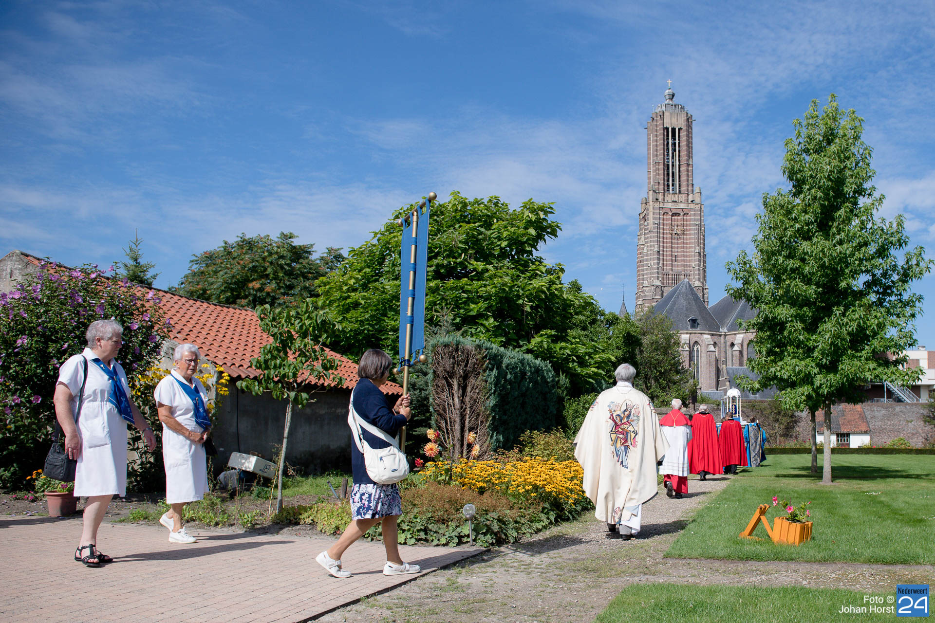 Vandaag vierde het Broederschap Weert ook de Maria-Tenhemelopneming in de Sint-Martinuskerk Weert. Het was zo anders voorgesteld op deze feestdag. De broederschap bestaat 25 jaar en dat wilden ze graag groots vieren in de tuin bij de zusters op de Maasstraat. Helaas zijn er nog steeds beperkingen vanwege Corona. Niet echt een processie maar het lijkt er wel sterk op wanneer de misgangers zich naar het klooster begeven.