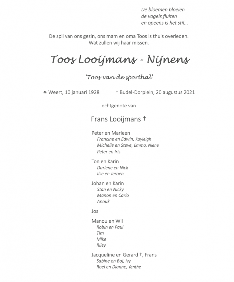 Overlijdensbericht: Toos Looijmans – Nijnens †