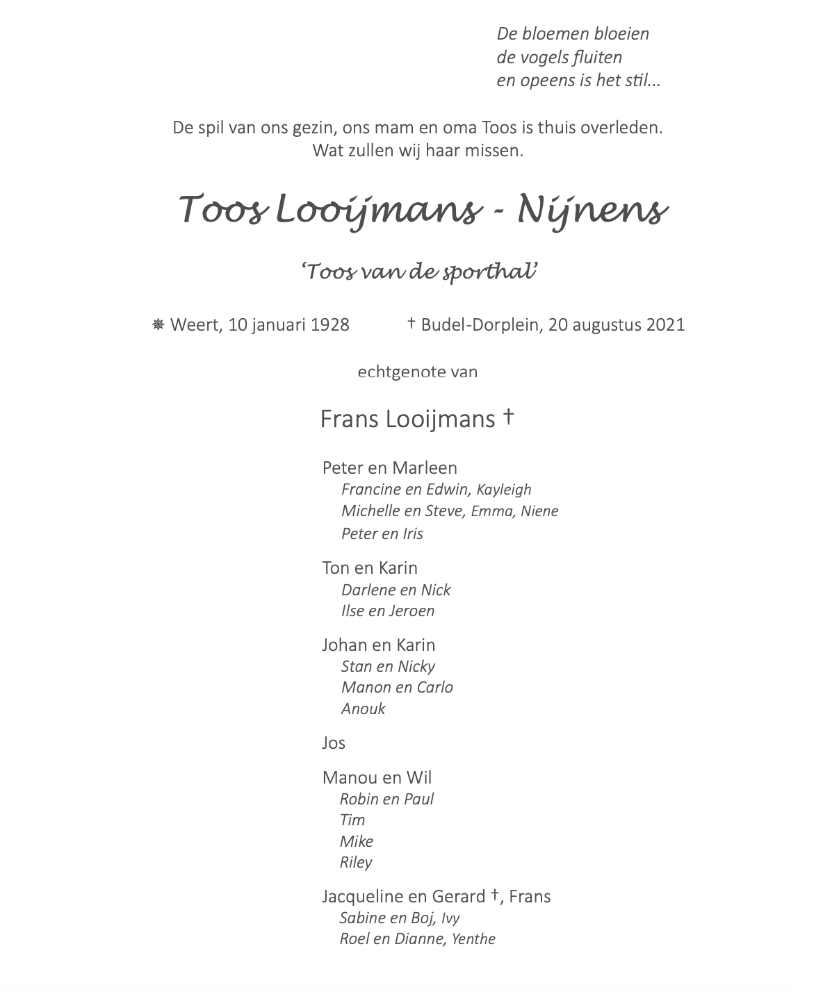 Overlijdensbericht: Toos Looijmans – Nijnens †