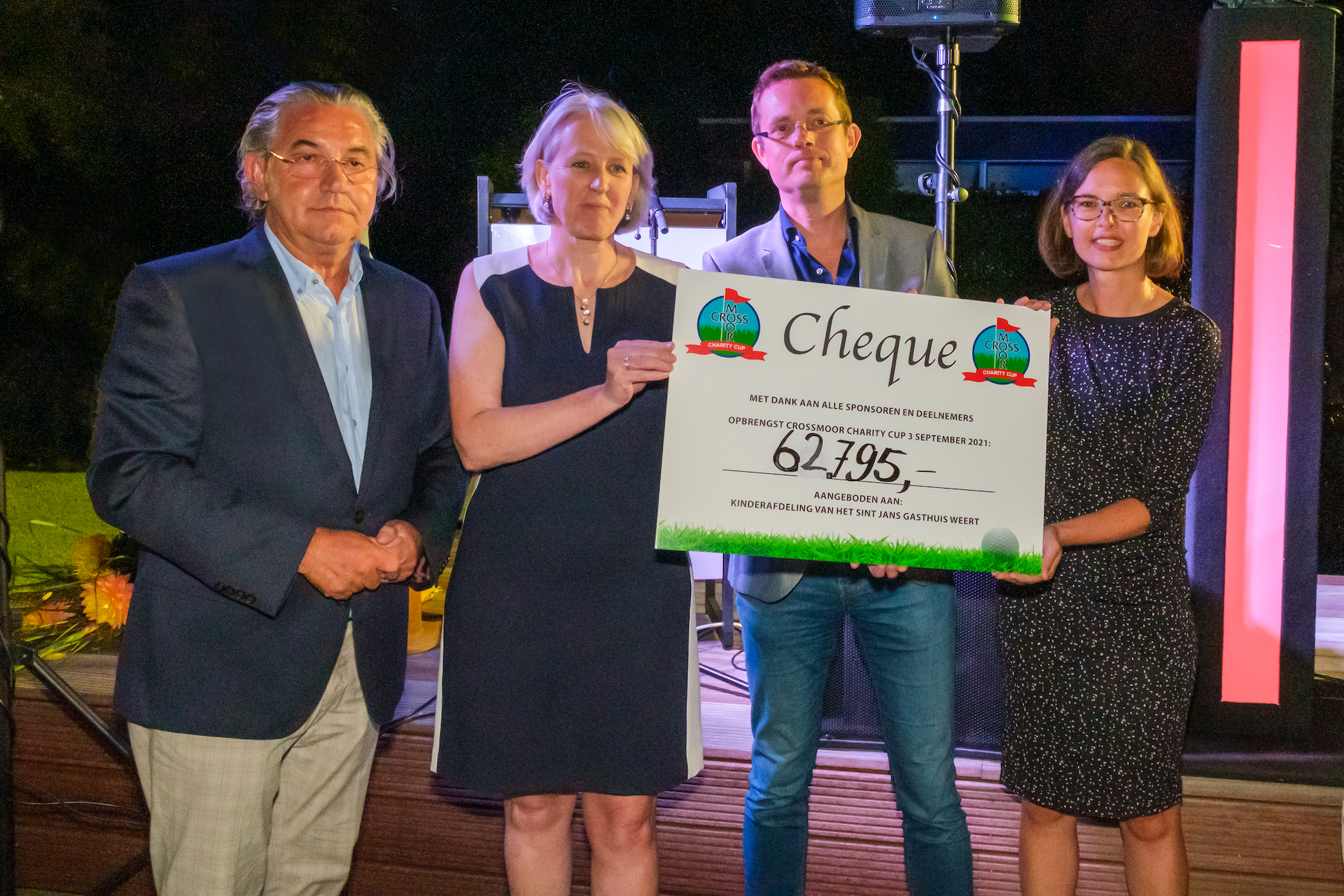 Kort na 21.00 uur kon voorzitter Vincent Nies van de Crossmoor Charity Cup het totaal bedrag bekend maken en een cheque overhandigen van maar liefst € 62.795,00 aan de afvaardiging van de Kinderafdeling van het St. Jans Gasthuis. Wederom is de organisatie van dit event erin geslaagd om een groot geldbedrag bijelkaar te krijgen voor een Weerter Goede Doel. “Wij danken de Crossmoor Charity Cup voor deze prachtige gift, zo kunnen we kinderen in een vervelende periode toch wat meer plezier bieden” aldus Mieke van Helvoirt.
