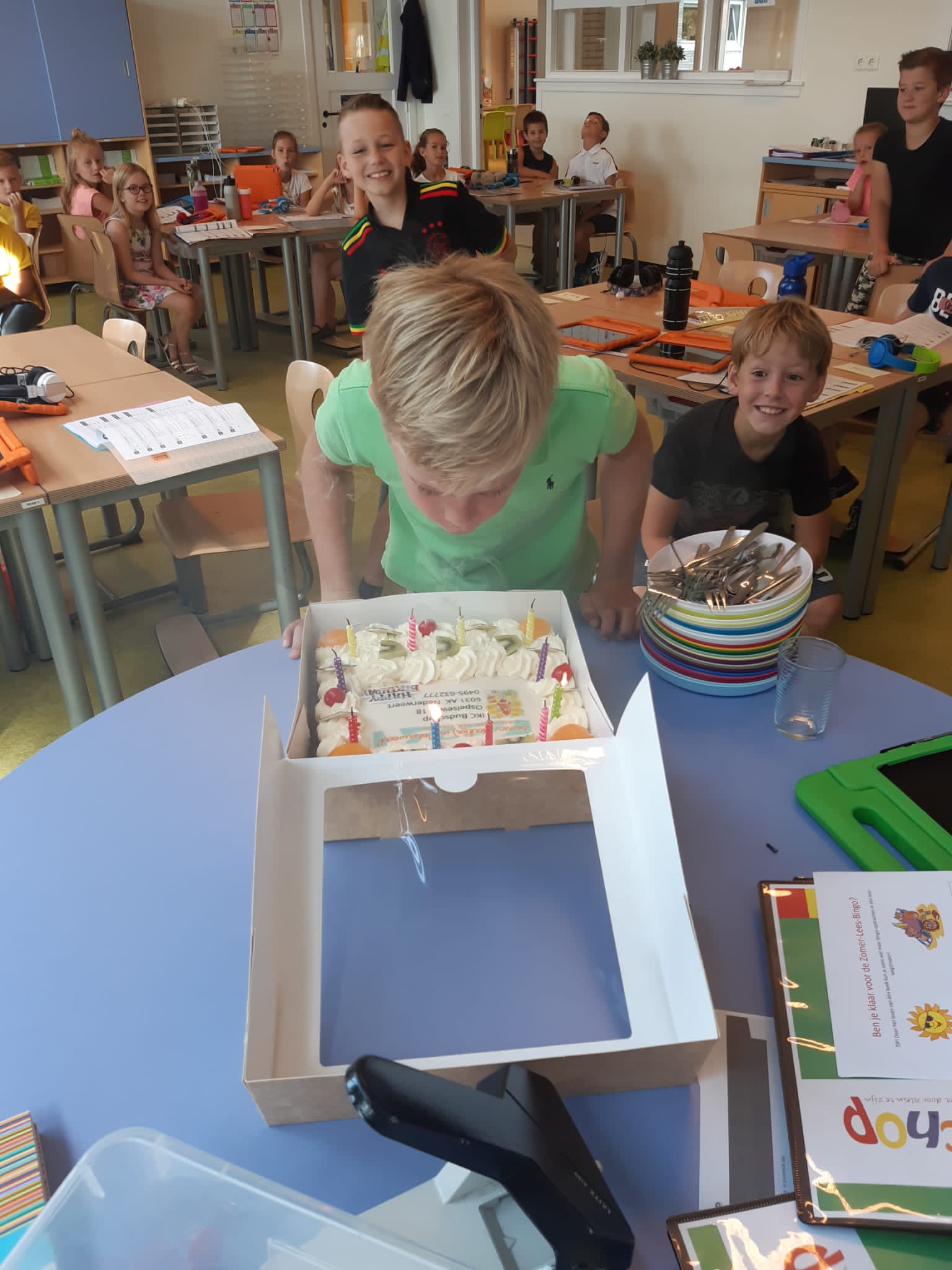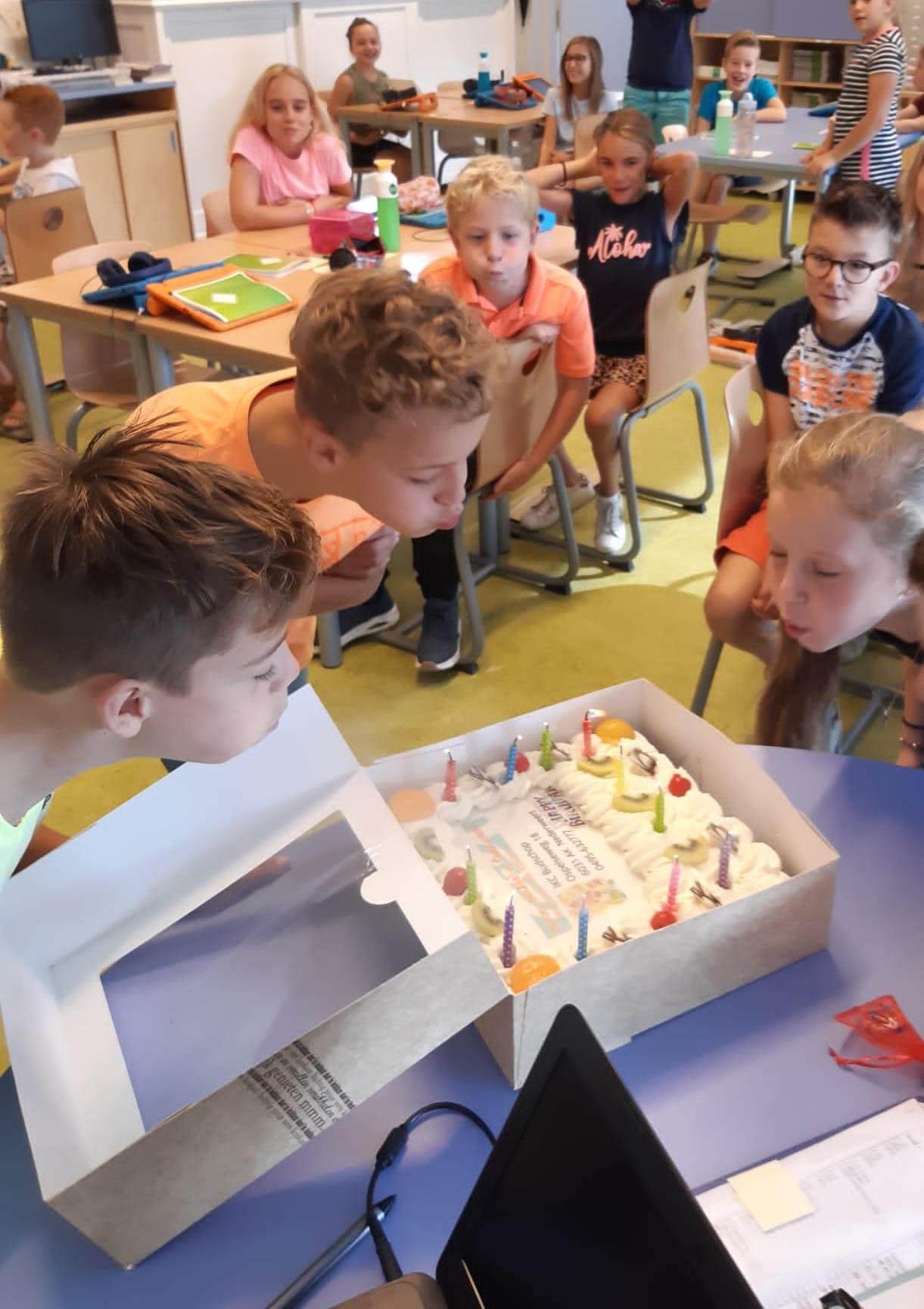 Een 65e verjaardag mag gevierd worden en dat gaan de kinderen en medewerkers van IKC Budschop zeker doen. Vandaag kwam Bakkerij Tommie zes verjaardagstaarten brengen, zodat alle kinderen samen 65 kaarsjes uit konden blazen.