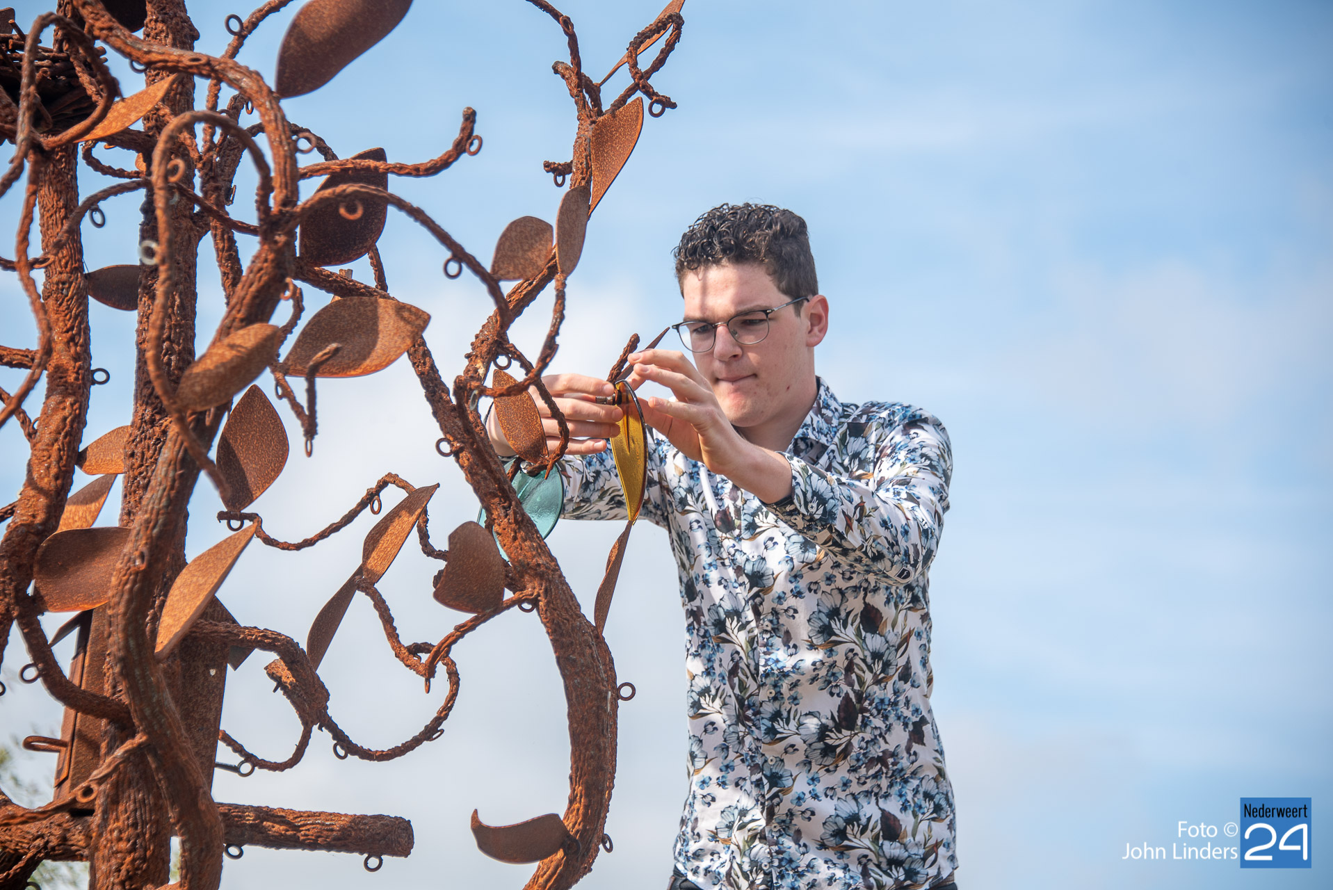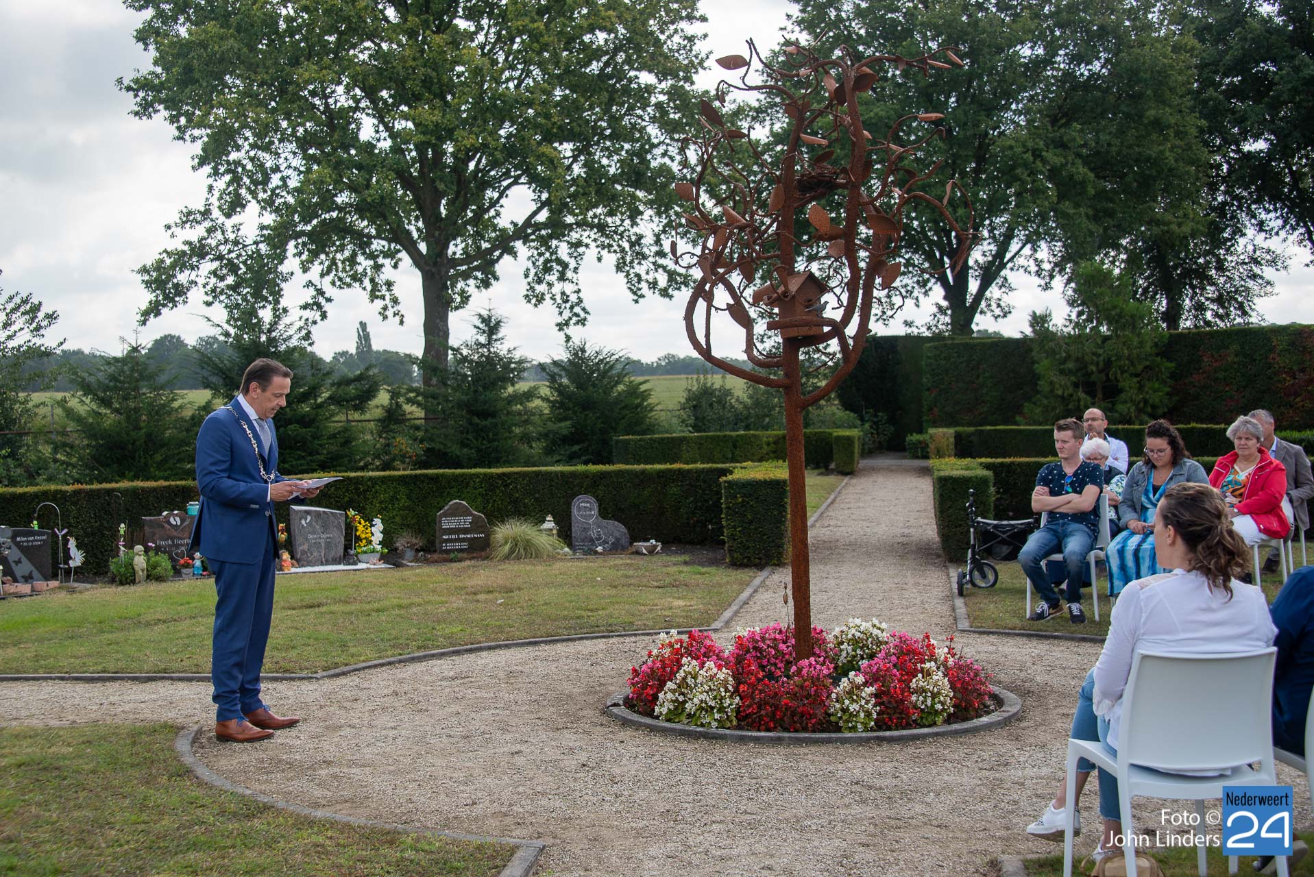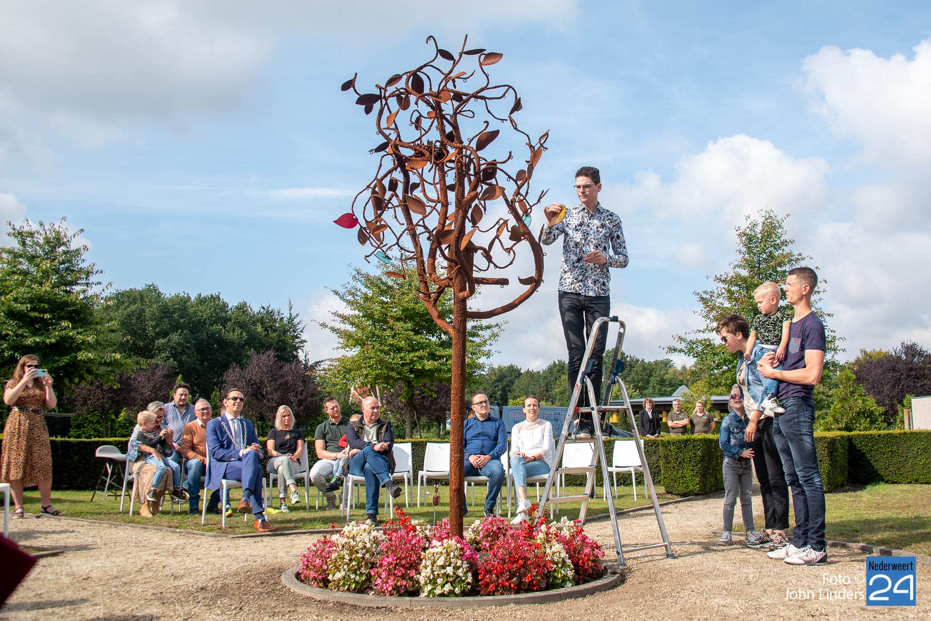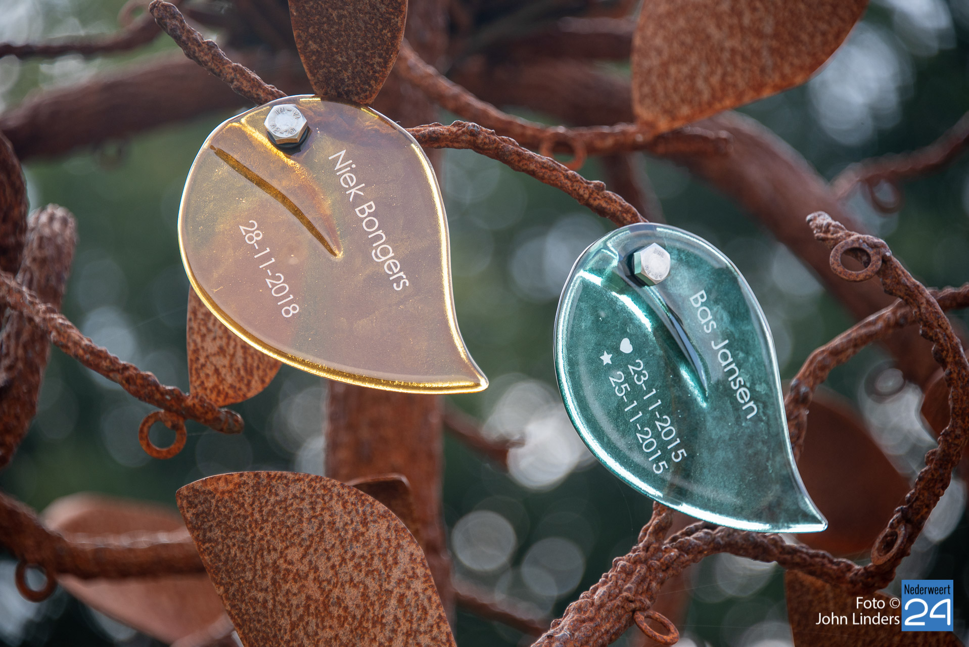 Dit gebeurde vandaag 12 september 2021. Jori met zijn familie, techniekdocenten van Het Kwadrant, enkele ouders van overleden kinderen, burgemeester Roland van Kessel en andere genodigde waren aanwezig tijdens het mooie moment van in gebruik name. Na een mooi woord van welkom en het verhaal van het ontstaan van de boom door Martin Horst was er het woord aan burgemeester Roland van Kessel. Ook was het de eer aan de burgemeester om samen met Jori het eerste glazen blad aan de boom te hangen met de tekst “in ons ♥ gesloten”. Hierna werden een voor een de ouders met familieleden uitgenodigd om ook een blad aan de boom te hangen ter herinnering aan de overleden dierbaren. Een emotioneel moment voor enkele ouders omdat er eindelijk erkenning was voor de nieuwe mooie plek van de graven en dat er een mogelijkheid geboden word aan ouders om hier een blad aan de boom te hangen om de overleden kinderen te herinneren.