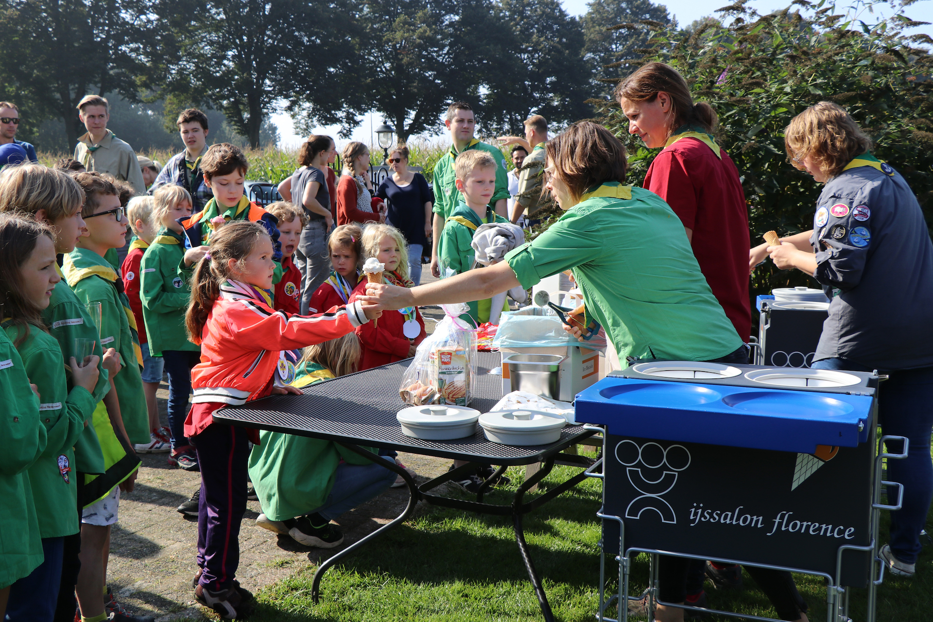 Omringd door vele scouts en geïnteresseerden werden de handtekeningen gezet en na een daverend applaus werd er geproost op deze eerste belangrijke stap. “Wij krijgen een nieuwe hut!”: riep één van de jongste leden. En om de vreugde nog wat groter te maken trakteerden Florence en Saniceve op een heerlijk ijsje.