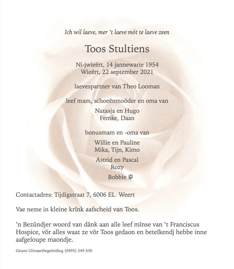 Fam.Stultiens heel veel sterkte met het verlies van Toos.