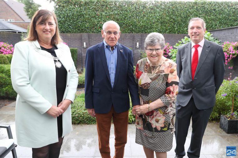 Zestig jaar getrouwd: een heel mooi jubileum voor Wiel en Truus van Eijk-Wijen uit Nederweert. Burgemeester Op de Laak en wethouder Koolen kwamen het diamanten paar feliciteren.
