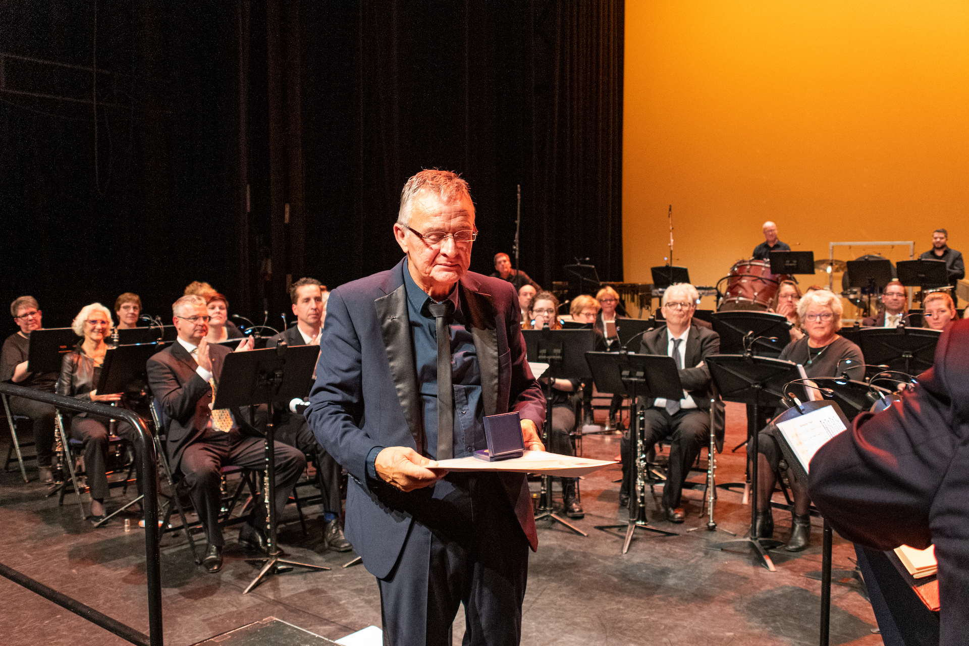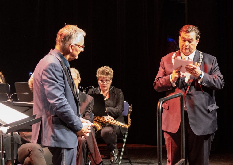 Aan het einde van een geslaagd Oranjeconcert ontving Tjeu Snoek, al meer dan 25 jaar dirigent van de Stedelijke harmonie St. Antonius, uit handen van Burgemeester Vlecken de Van Hornepenning.