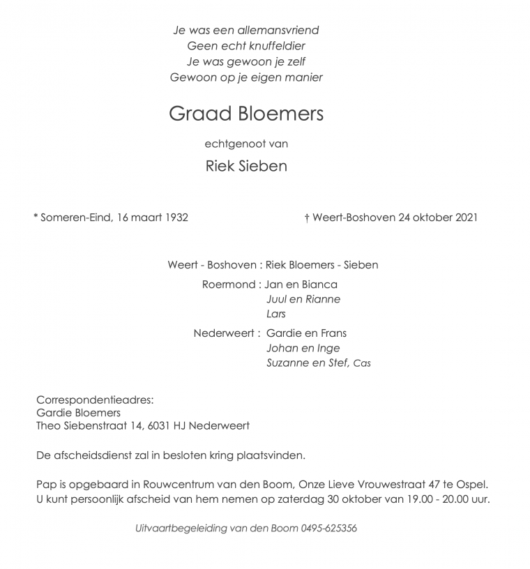 En voor de nabestaande heel veel sterkte en kracht om samen door te gaan