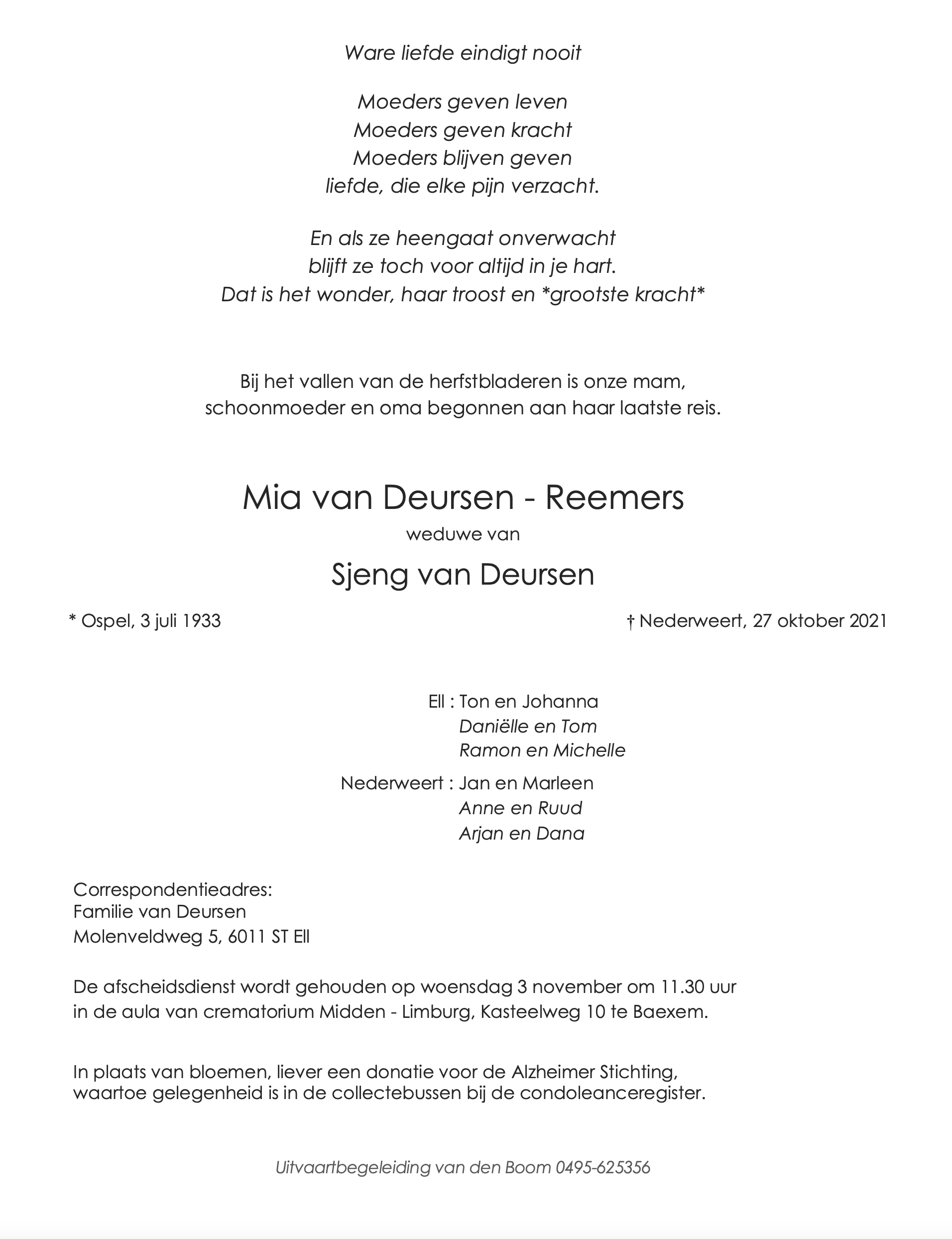 Heel veel sterkte met het heengaan van jullie lieve, (schoon), moeder en oma, Mia van Deursen. Ze had een warm hart en dat was te merken tijdens de afscheidsdienst in Baexem. Wat hebben jullie liefdevol over haar gesproken en wat een mooie foto’s kwamen er voorbij. Wat zal ze hierboven dankbaar en wederom trots op jullie zijn!