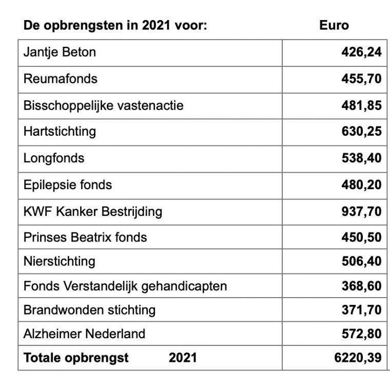 In het overzicht zijn opgenomen: de contant ontvangen bedragen alsmede de bedragen die via de bank zijn ontvangen. De niet per doel geoormerkte ontvangen gelden hebben wij onder alle fondsen, verdeeld naar rato van de wél geoormerkte gelden per goed doel.