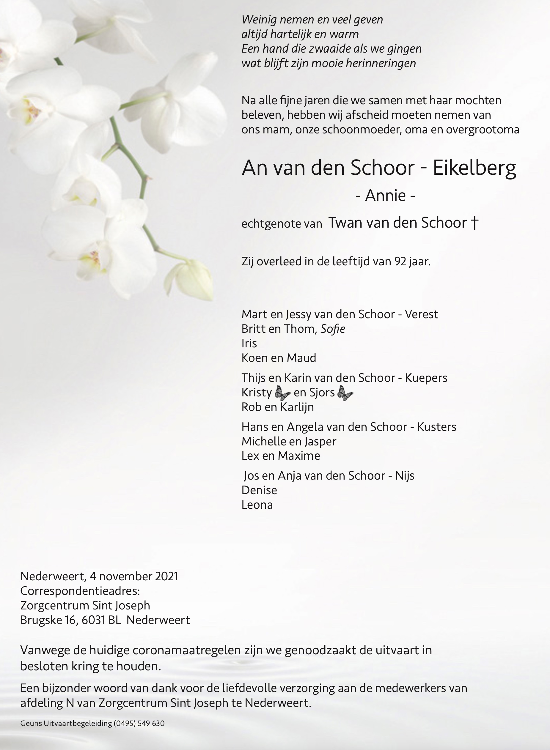 Overlijdenbericht An van den Schoor – Eikelberg †