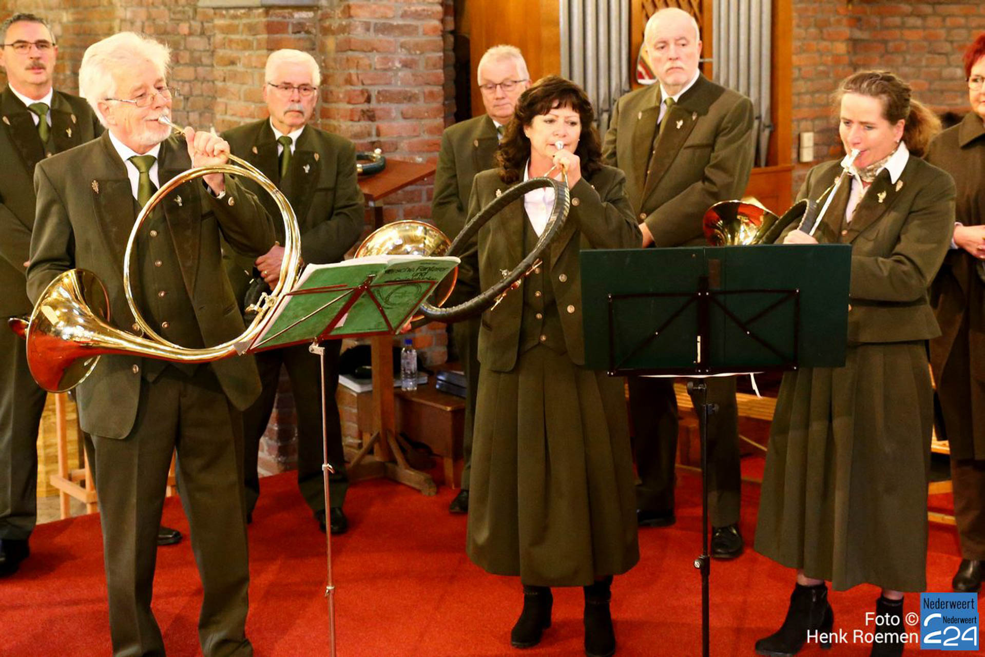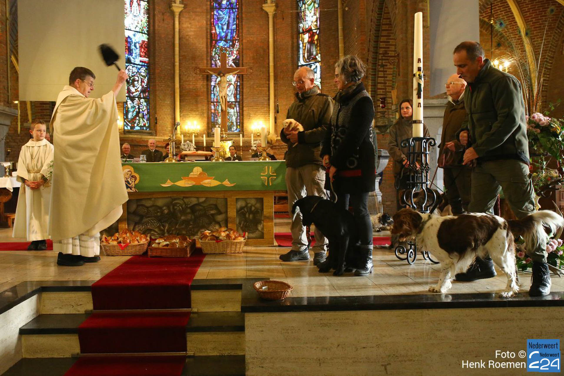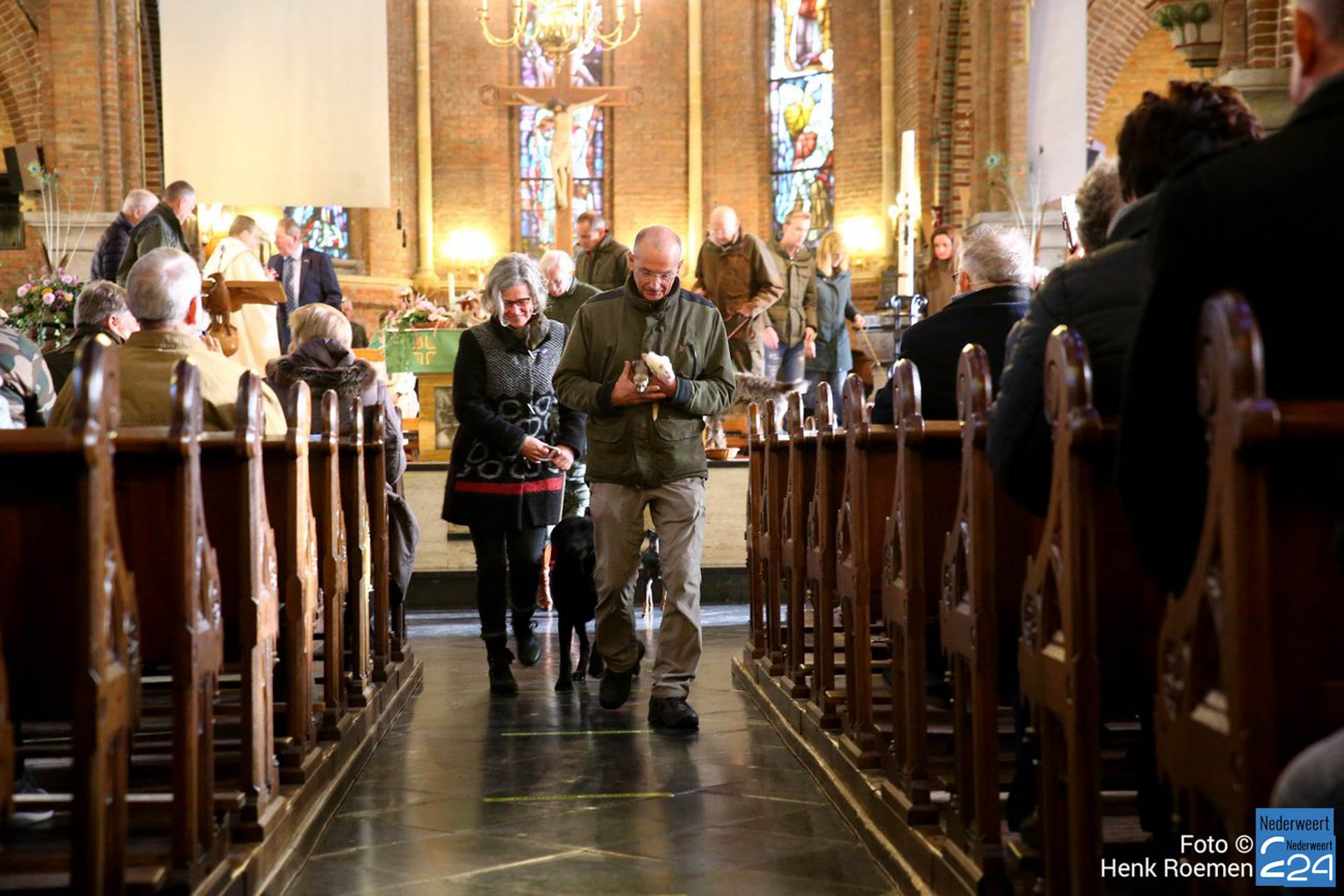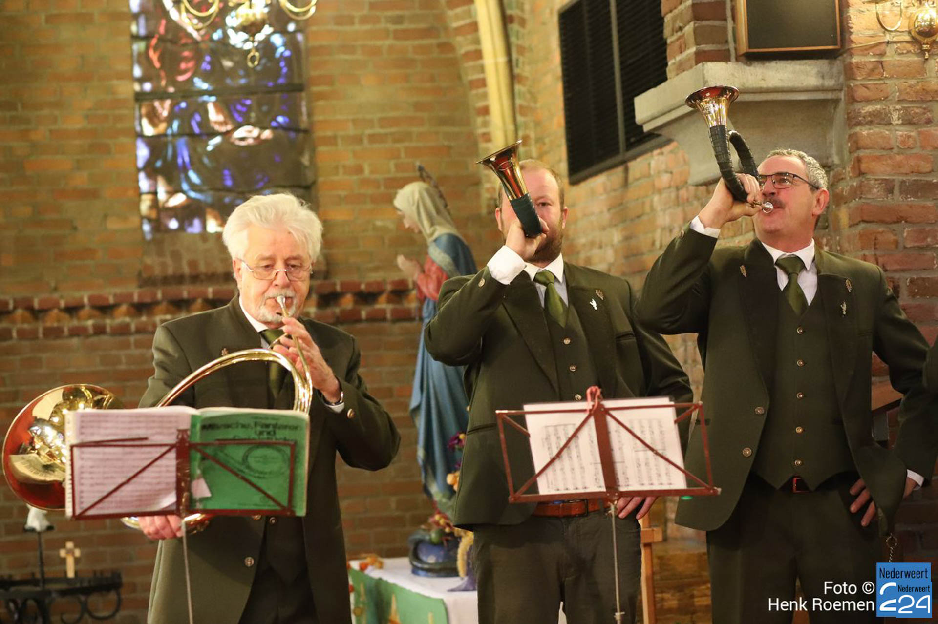 Pastoor Andre Koumans ging in deze viering voor en de Jachthoornblazersgroep Midden-Limburg luisterden de H.Mis muzikaal op. De jager / drijver kwamen in het groen’ en drijvers hadden hun drijverstok mee. Ook de jachthonden waren harte welkom.