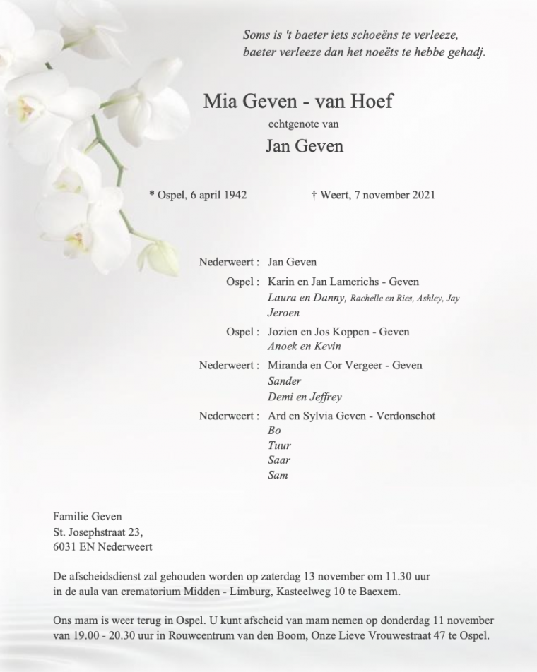 Gecondoleerd allemaal en heel veel sterkte met het overlijden van mam schoonmoeder en lieve oma en super oma sterkte voor de dagen die komen want het valt niet mee om afscheid te nemen van iemand die je zo dierbaar is