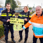 Vandaag waren, Joost Franssen (schoolagent gemeente Nederweert), Anne Philipsen (wijkagent van Nederweert) en Tjeu Stultiens (Veilig Verkeer Nederland) op pad om aandacht te besteden aan de fietsverlicht. Op verschillende plekken in Nederweert hebben ze ‘tags’ aangebracht.