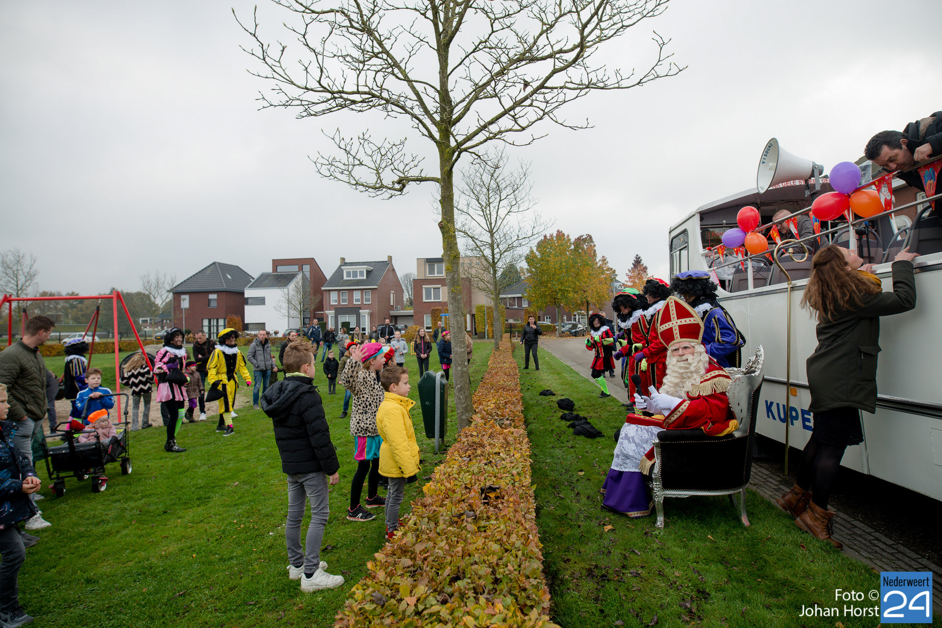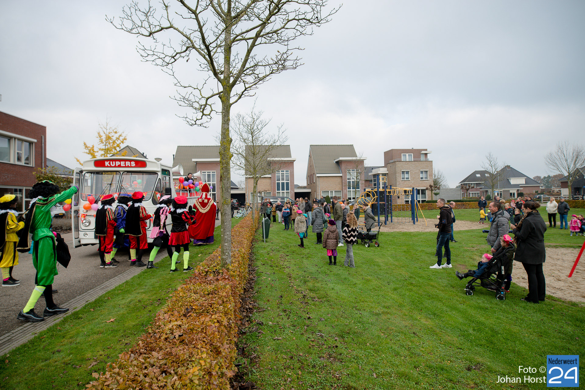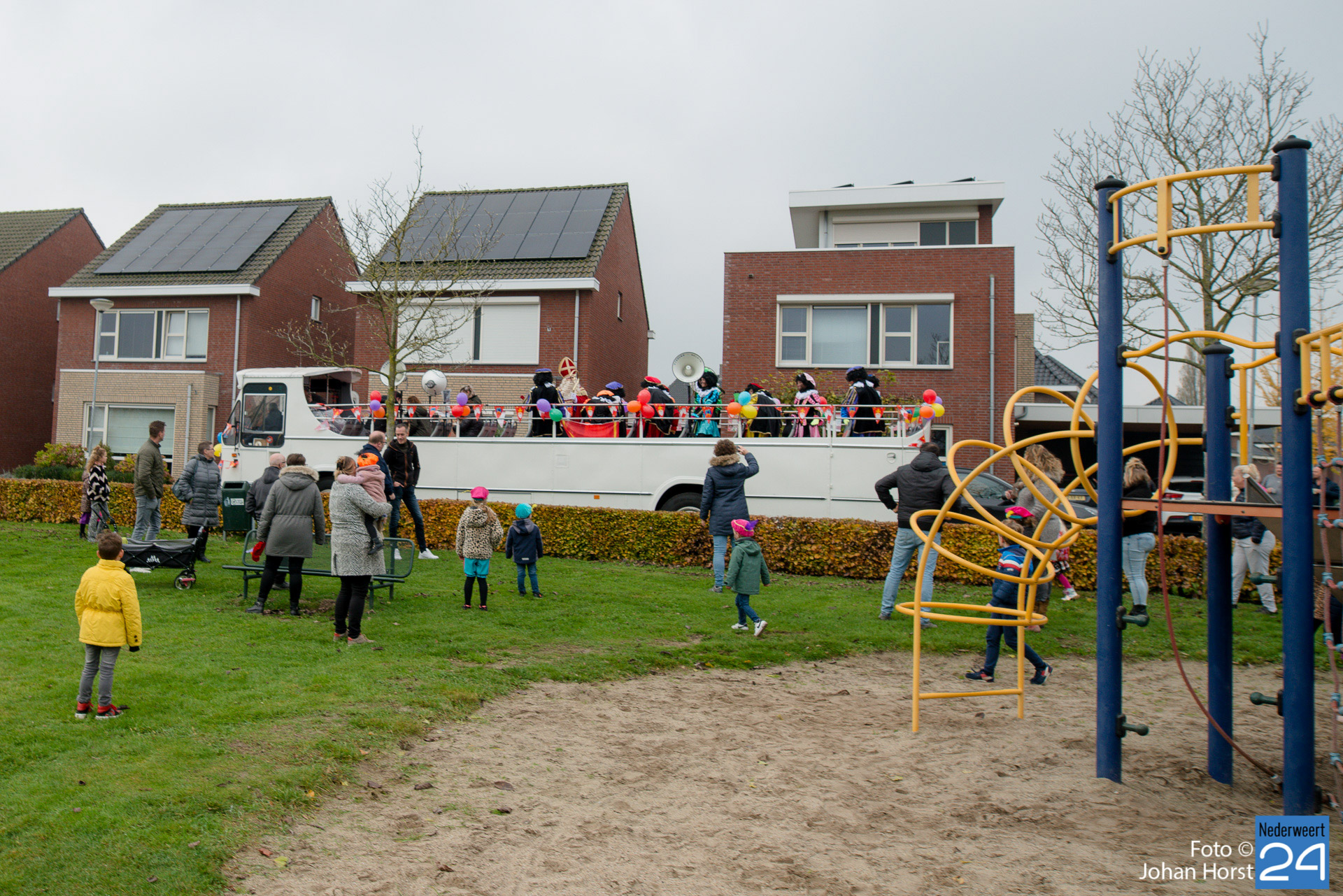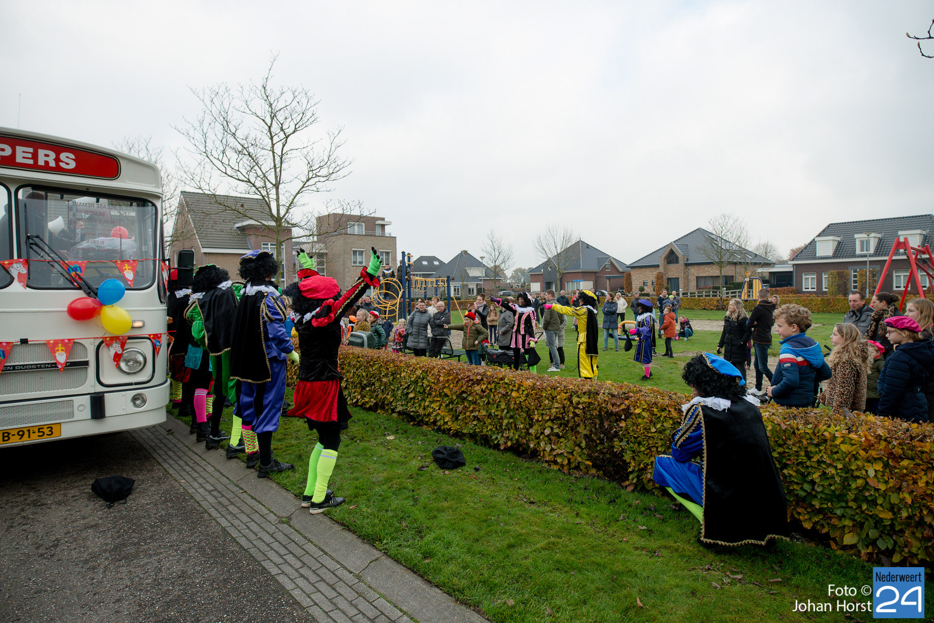 Met een grote bus bezocht de Sint en zijn Pieten vier locaties in het dorp. Er hing een gezellige sfeer in de speeltuintjes waar de goedheilig man op visite kwam.