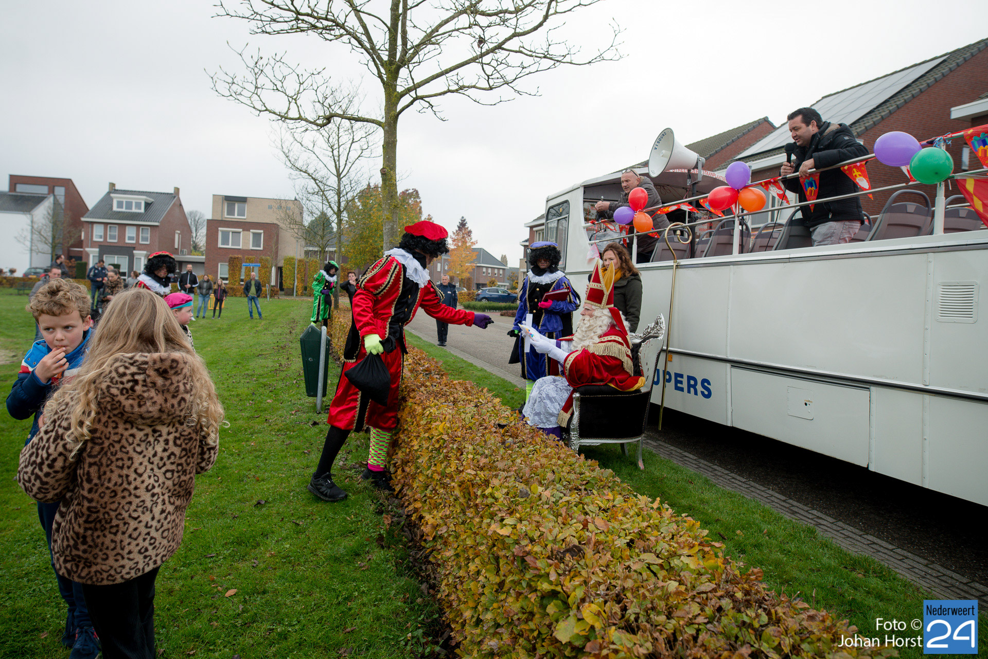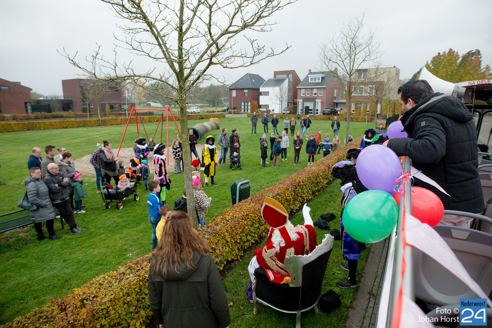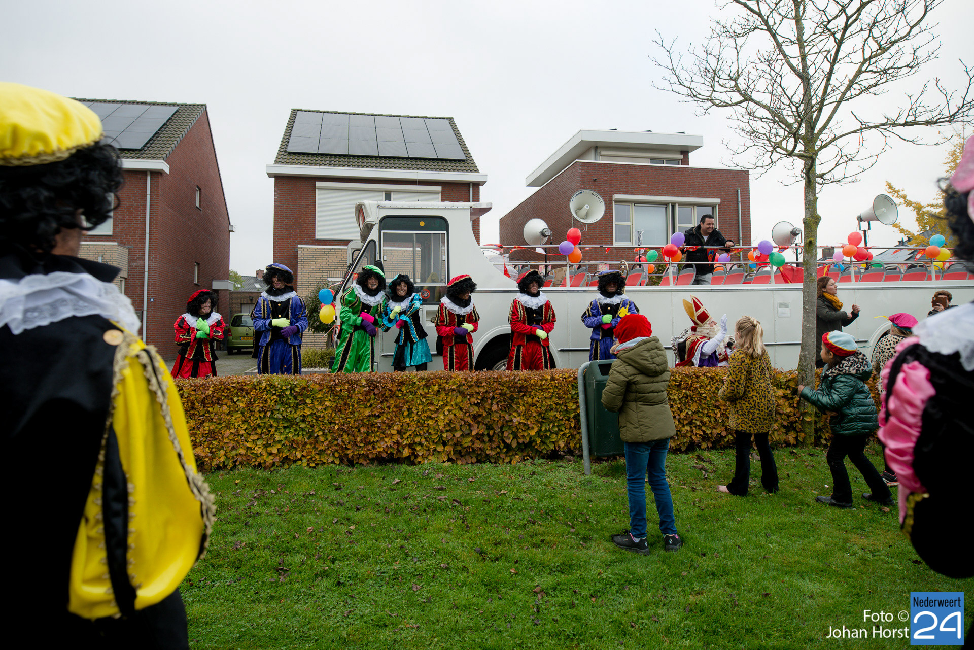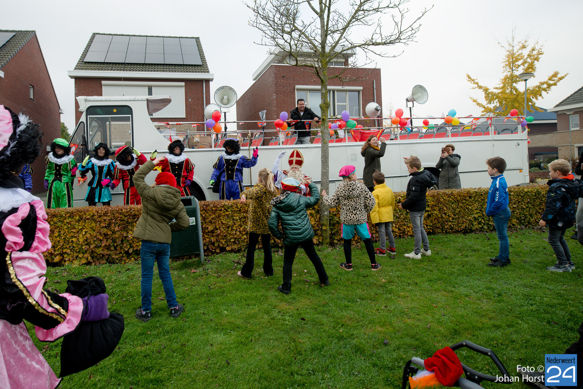 Met een grote bus bezocht de Sint en zijn Pieten vier locaties in het dorp. Er hing een gezellige sfeer in de speeltuintjes waar de goedheilig man op visite kwam.