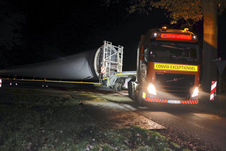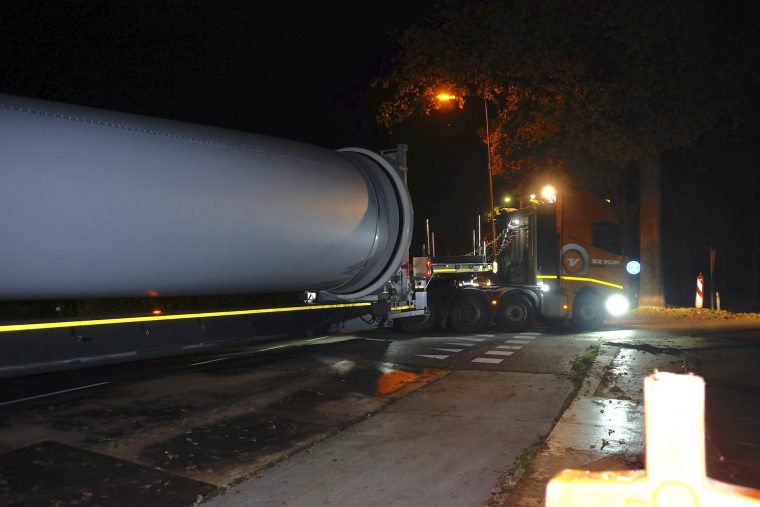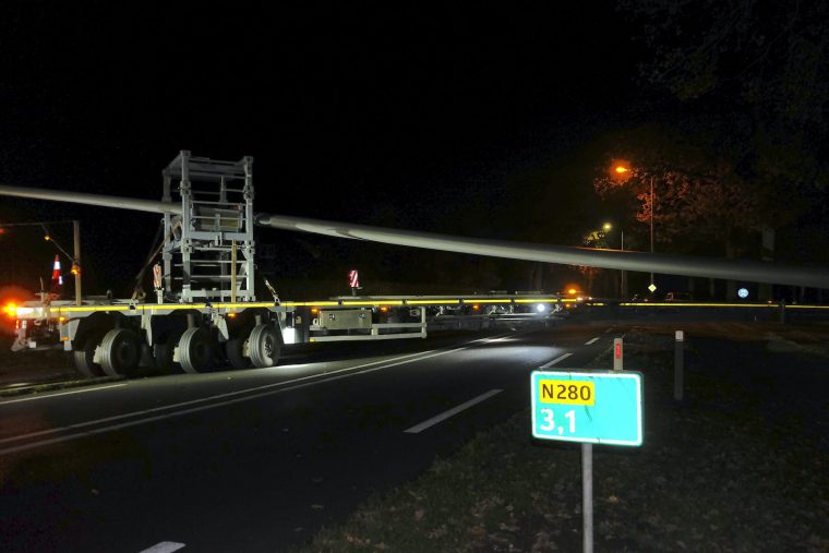 Maandag is de desbetreffende bocht verbreed. Gisteravond rijden de vrachtwagens met de bladen tot aan de spoorwegovergang op de Schoordijk. Waarna ze vannacht tussen 01.00 en 3.00 uur over de spoorwegovergang worden verplaats en op de bestemming gelost.