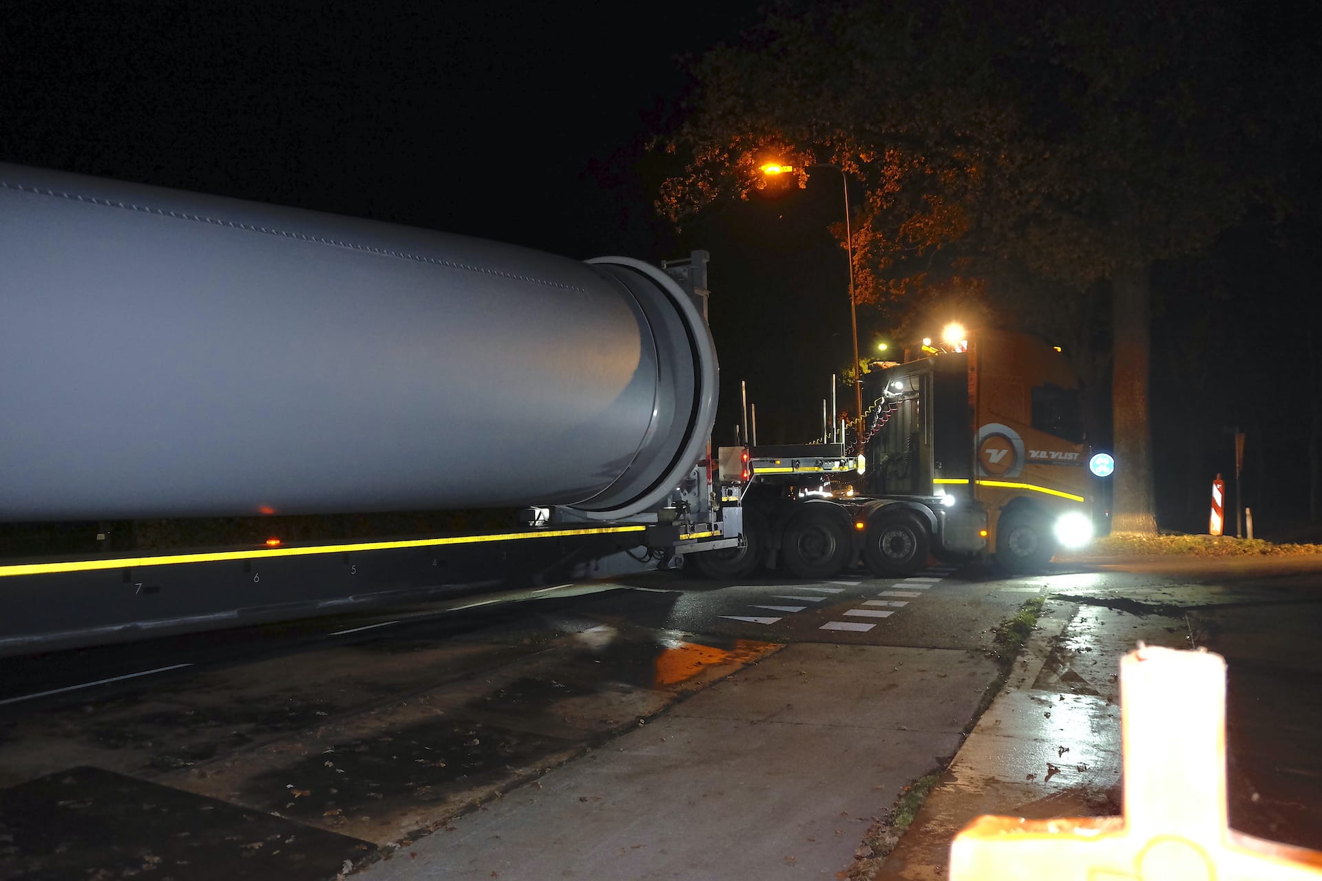 Het eerste grote transport met de wieken voor een van de windmolens van Windpark Weert arriveerde op maandag 15 november om 03.00 uur in Weert. Het ging om drie wieken van zeventig meter lang. Ondanks alle voorbereidingen kon het konvooi een bocht op de Schoordijk net niet goed maken.