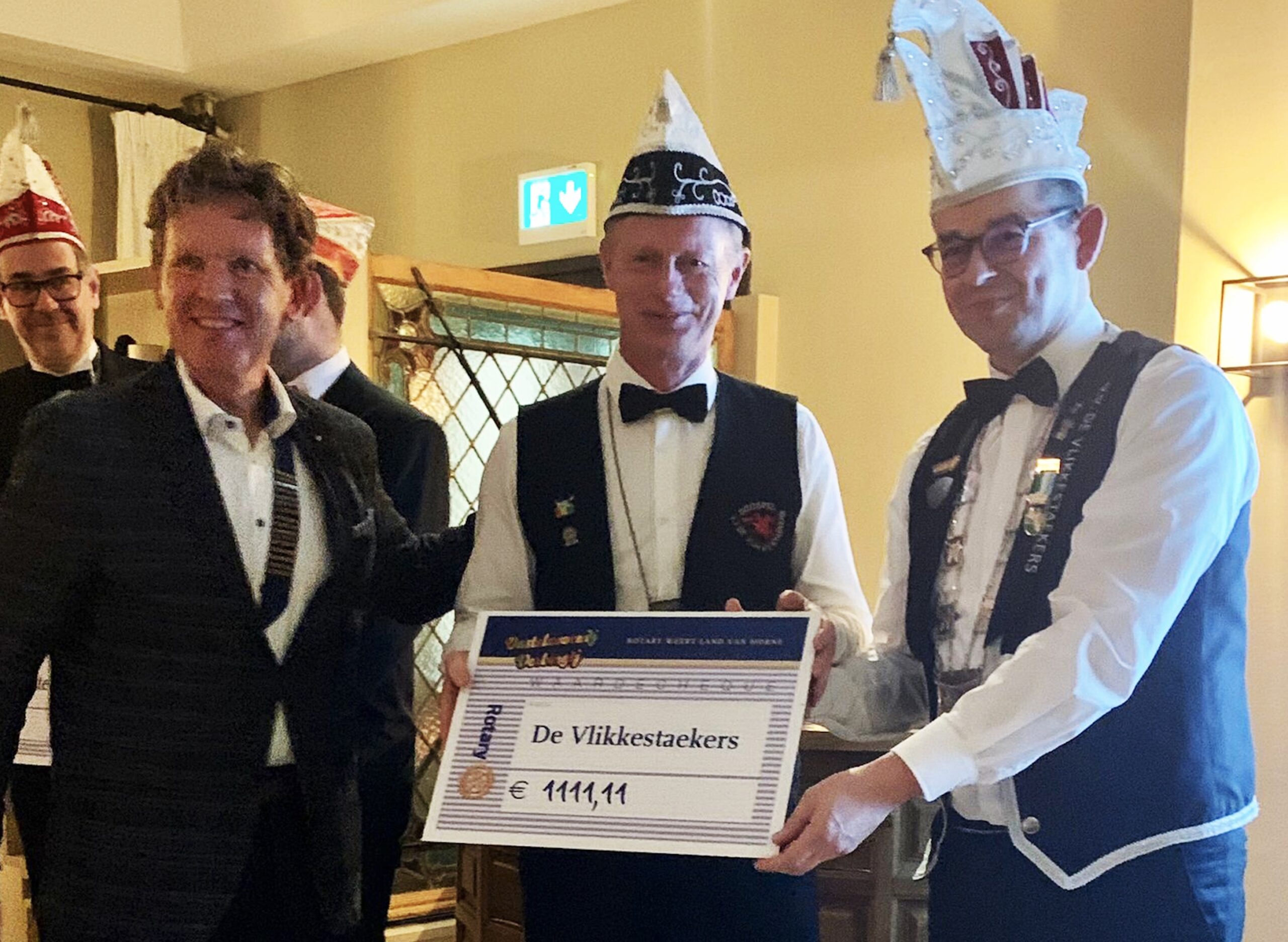 Op woensdag 17 november hebben diverse carnavalsverenigingen uit het Weerterland een cheque in ontvangst genomen uit handen van Rotary Weert land van Horne. Het geldbedrag van meer dan 6000,- euro is opgehaald met een online carnavalsplatform en andere acties. Door Corona kon het carnavals seizoen 2020 – 2021 niet gevierd worden zoals we dat gewend zijn. Optochten, voorstellingen en samen feesten konden niet doorgaan. Serviceclub Rotary Weert land van Horne wil de geest van de lokale vastelaovendj juist in deze tijd levend houden door te verbinden en plezier te delen. Daarom is het vorig jaar in samenwerking met 6 verenigingen het online platform vvweerterland.nl gebouwd.