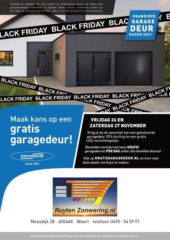 Op 26 en 27 november organiseert Ruyten zonwering de Grandioze Garagedeur Dagen. Wanneer je tijdens deze dagen de showroom bezoekt aan de Moesdijk 28 te Weert en een garagedeur bestelt, dan krijg je 25% korting bij aanschaf van een Novoferm garagedeur én een gratis LED-verlichtingslijst. Tevens ding je mee naar een gratis garagedeur.